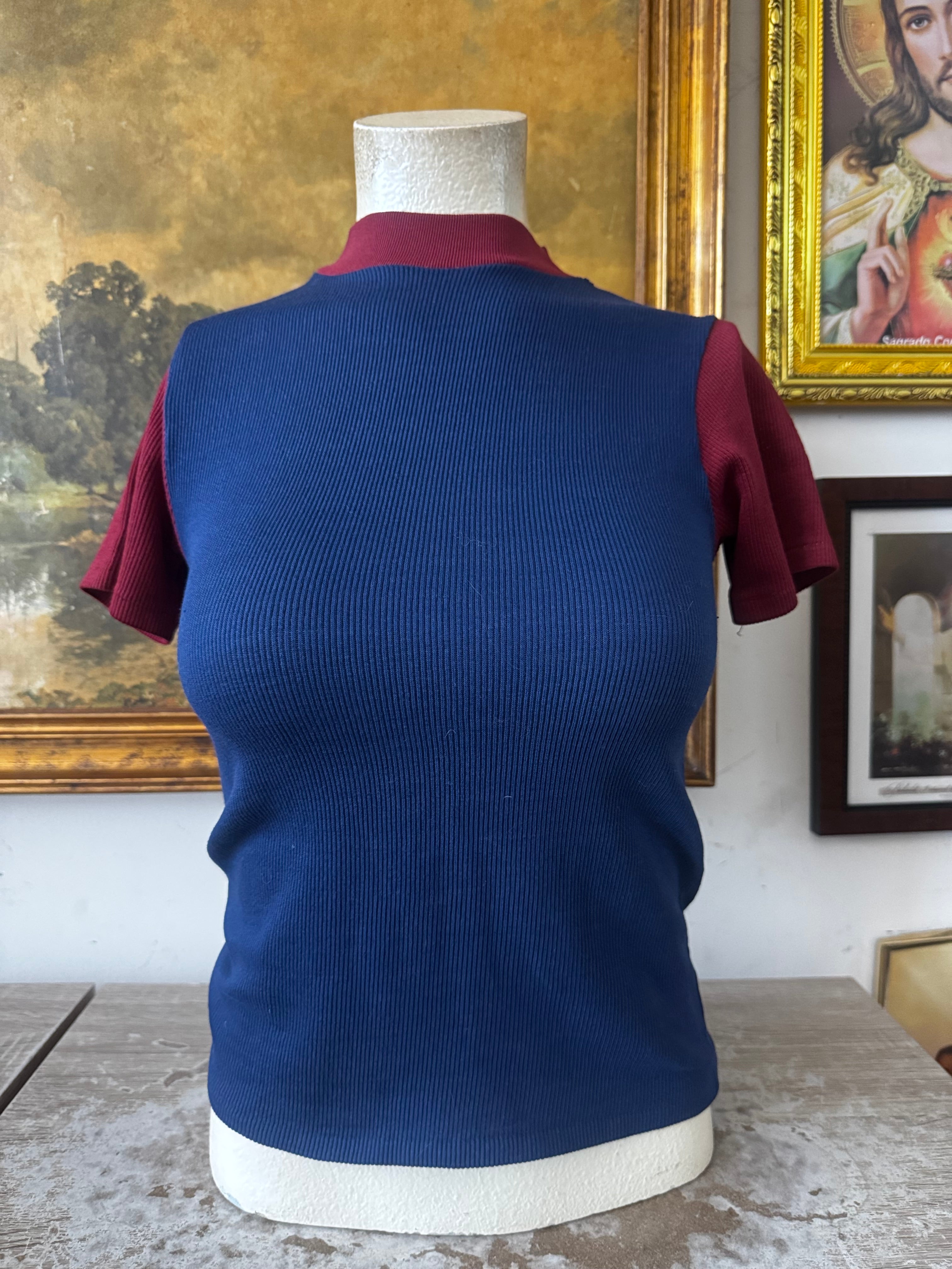 80s Youth Large Blue and Burgundy High Neck Top Ladies Small