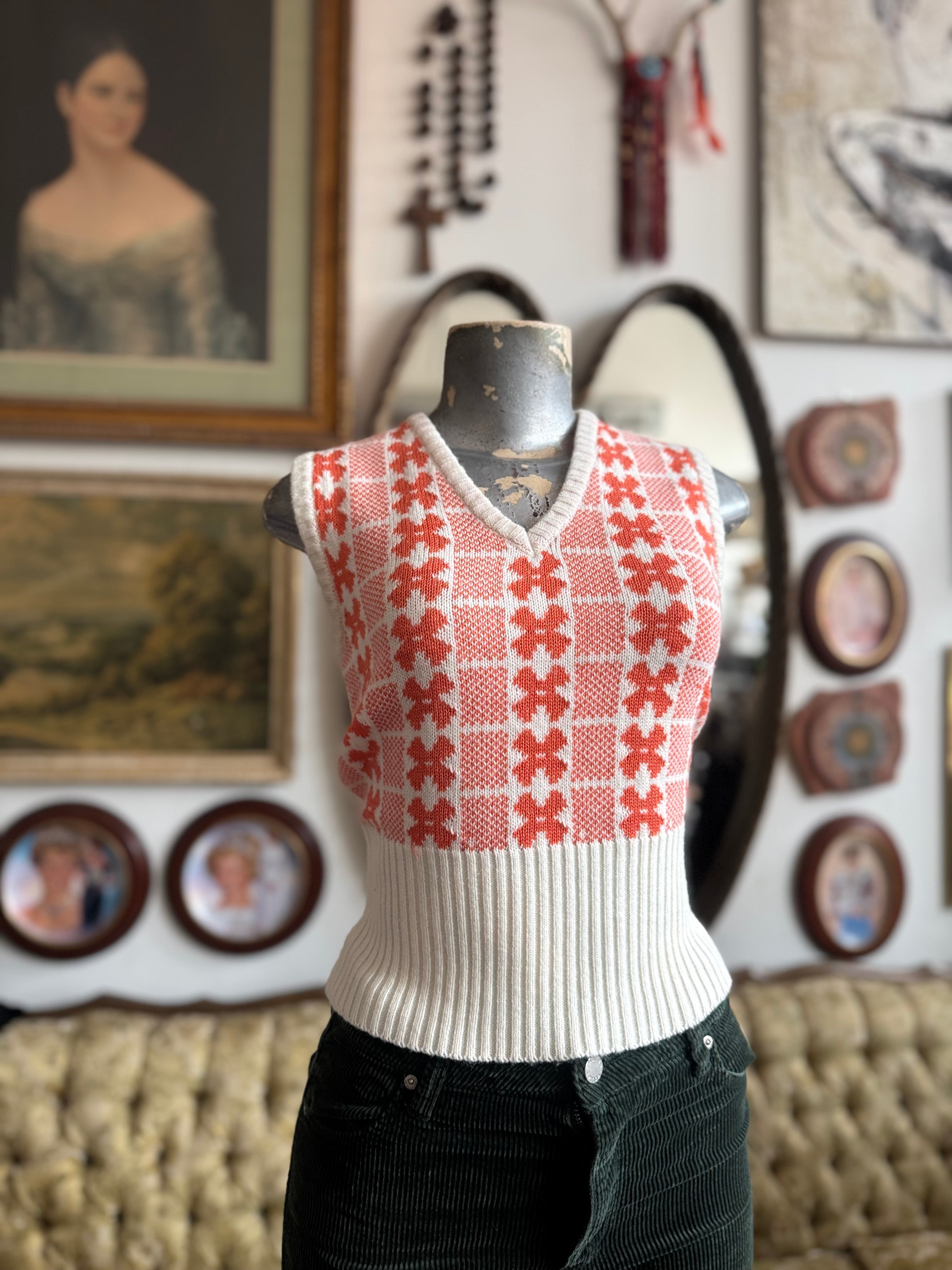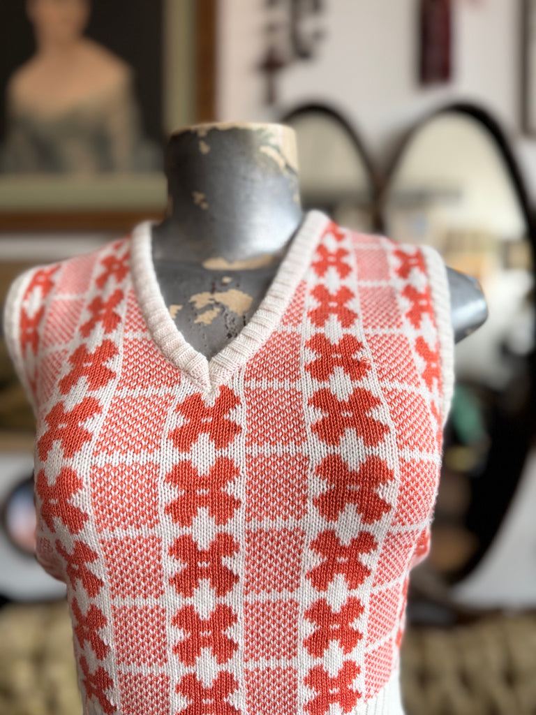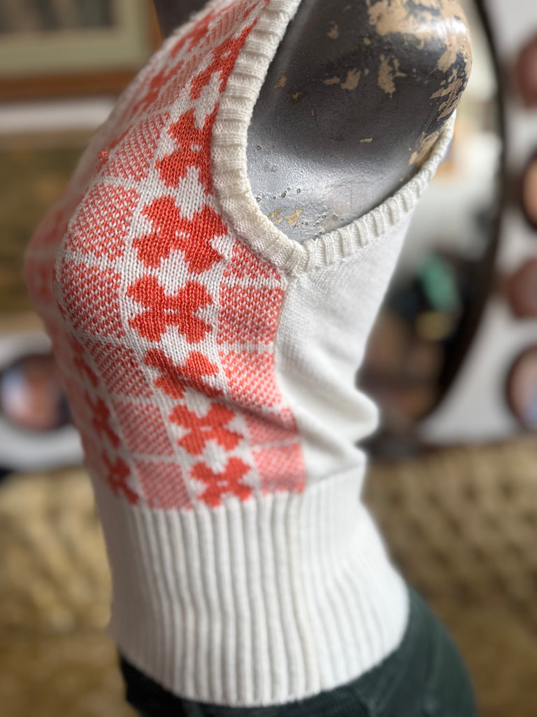 Graphic cream and orange patterned 100% knit vest from the 60s-70s