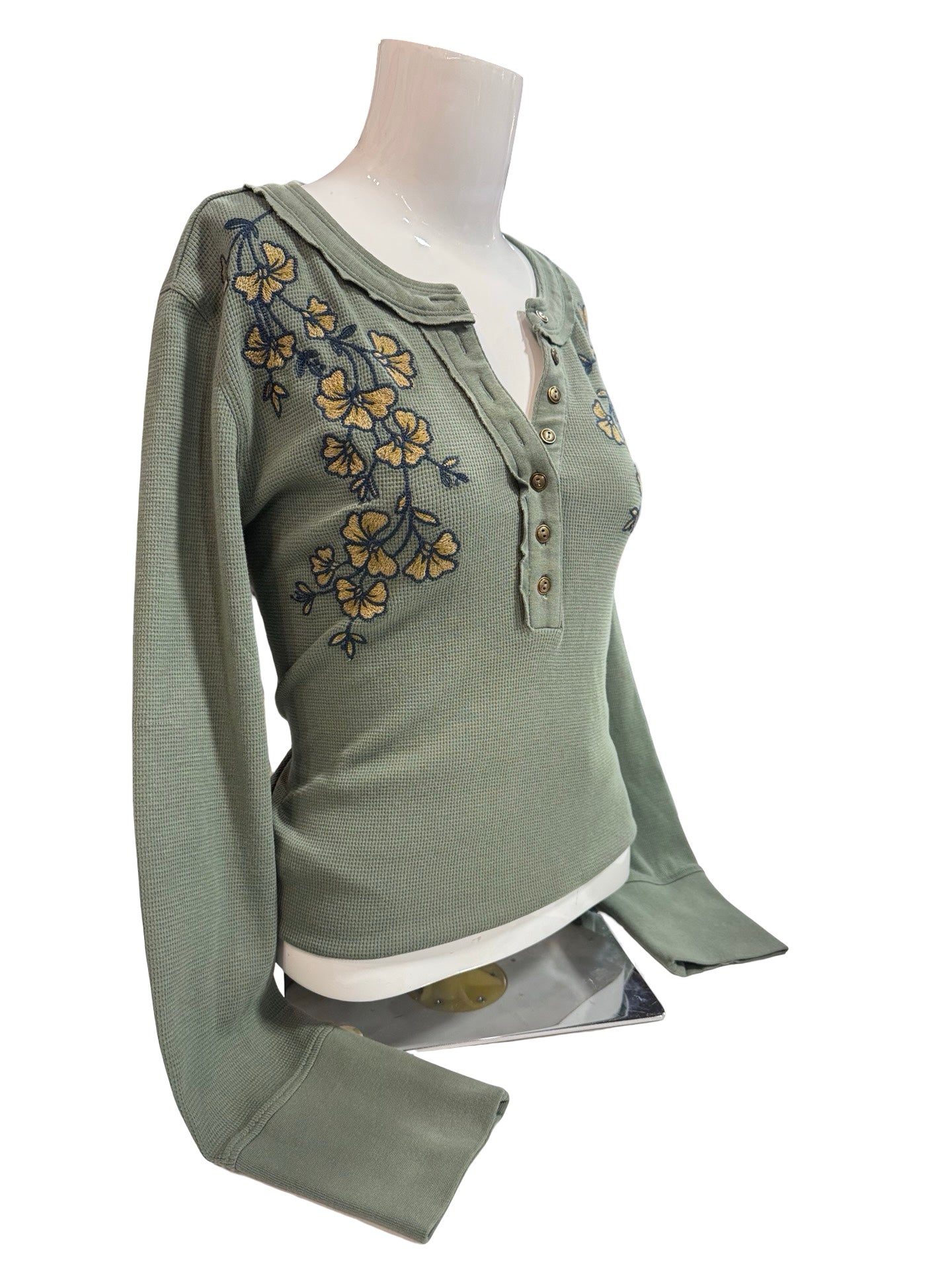 90s Floral Embroidered Henley Thermal Top Size M