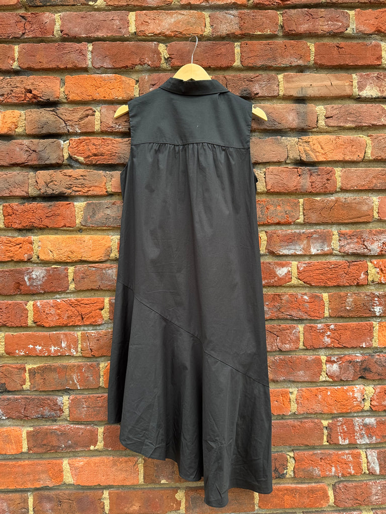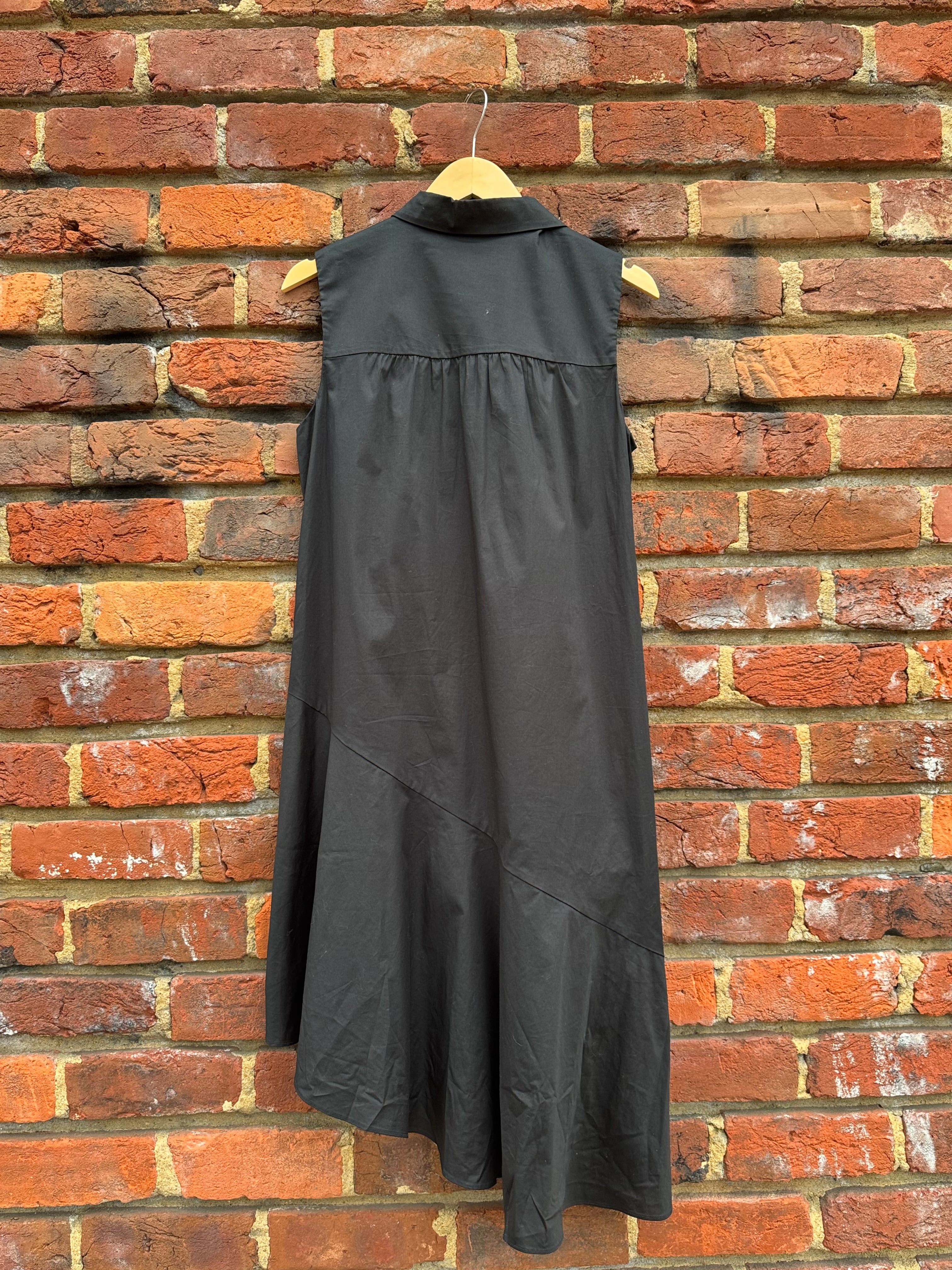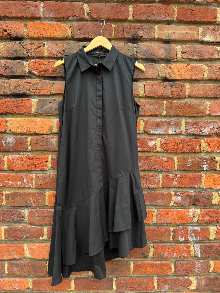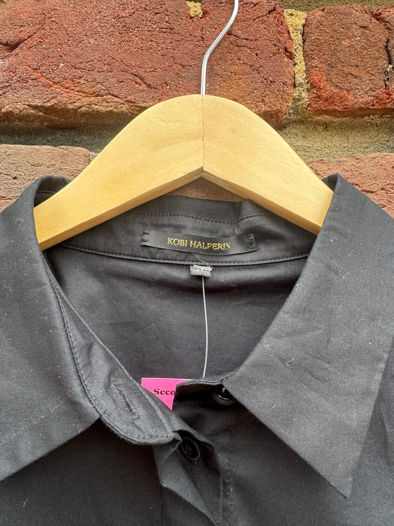Black collared button up asymmetrical hem dress by Kodi Halperin.