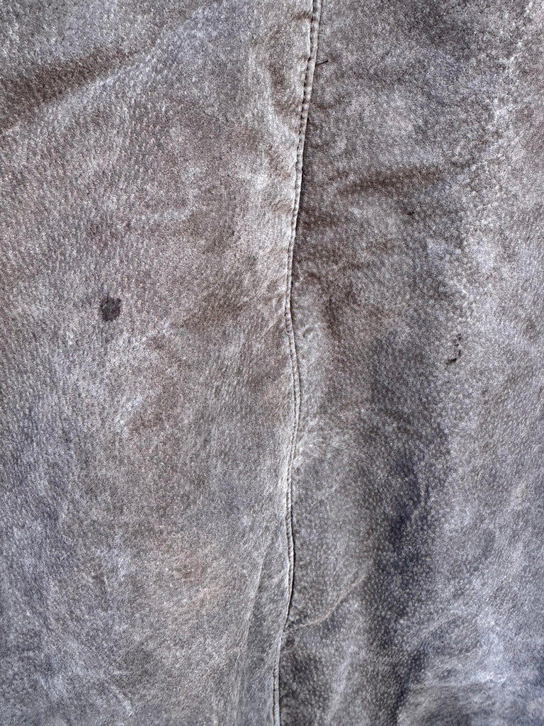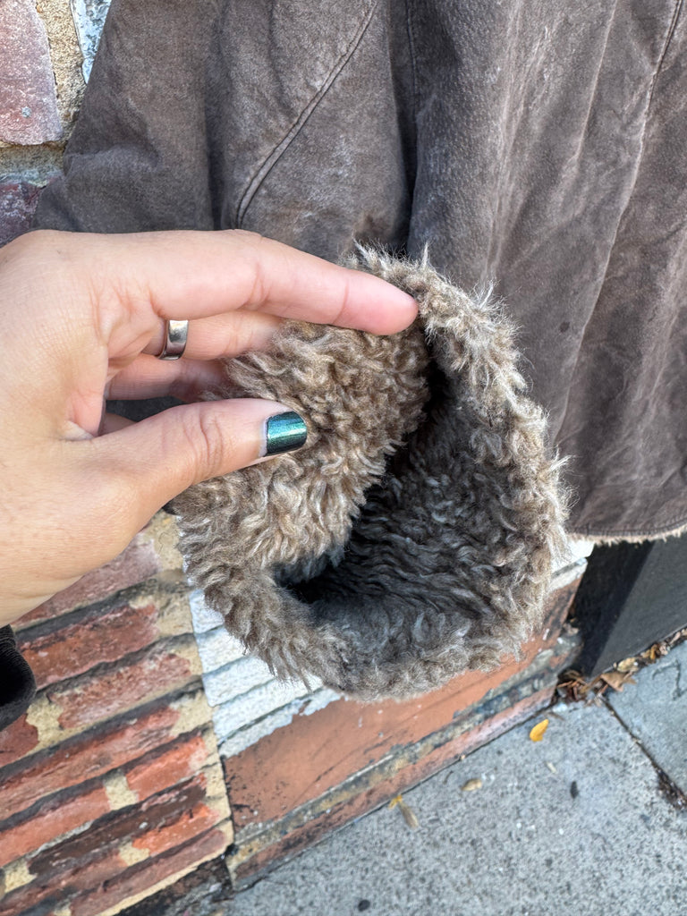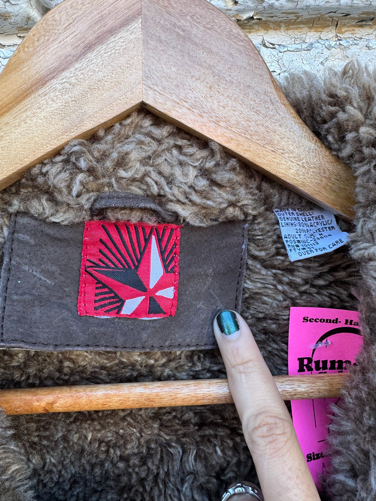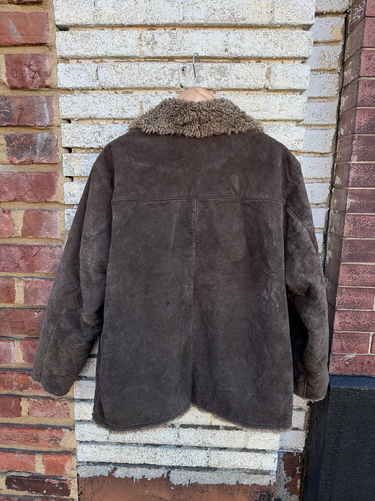 Brown leather faux fur lined button up coat. Sold AS-is (Small stain on the the back)