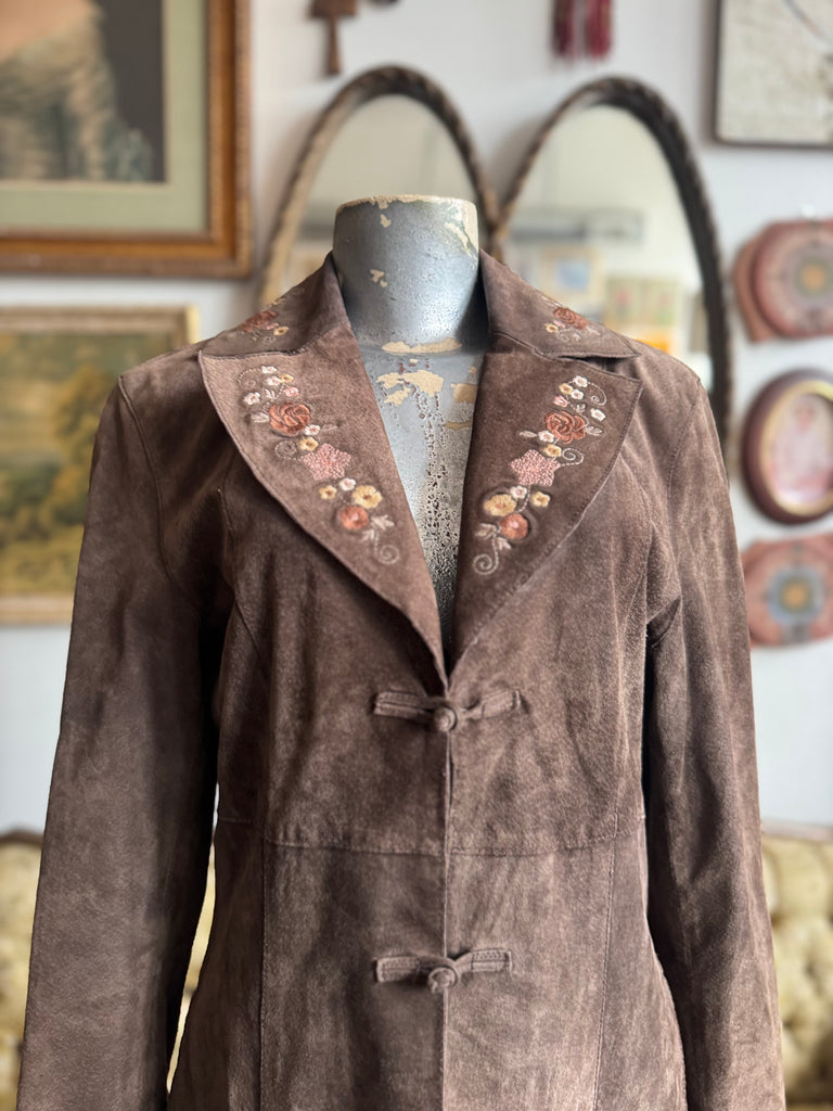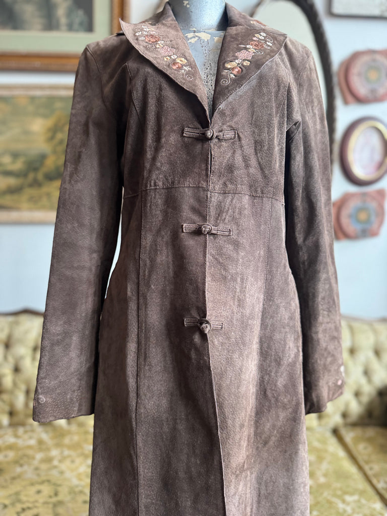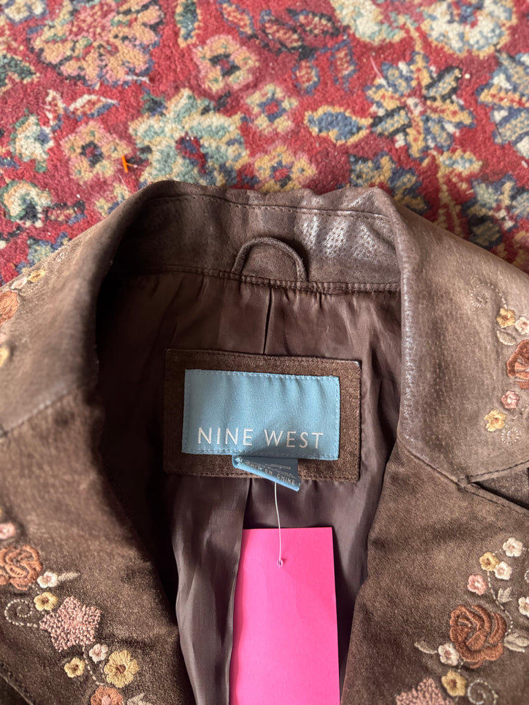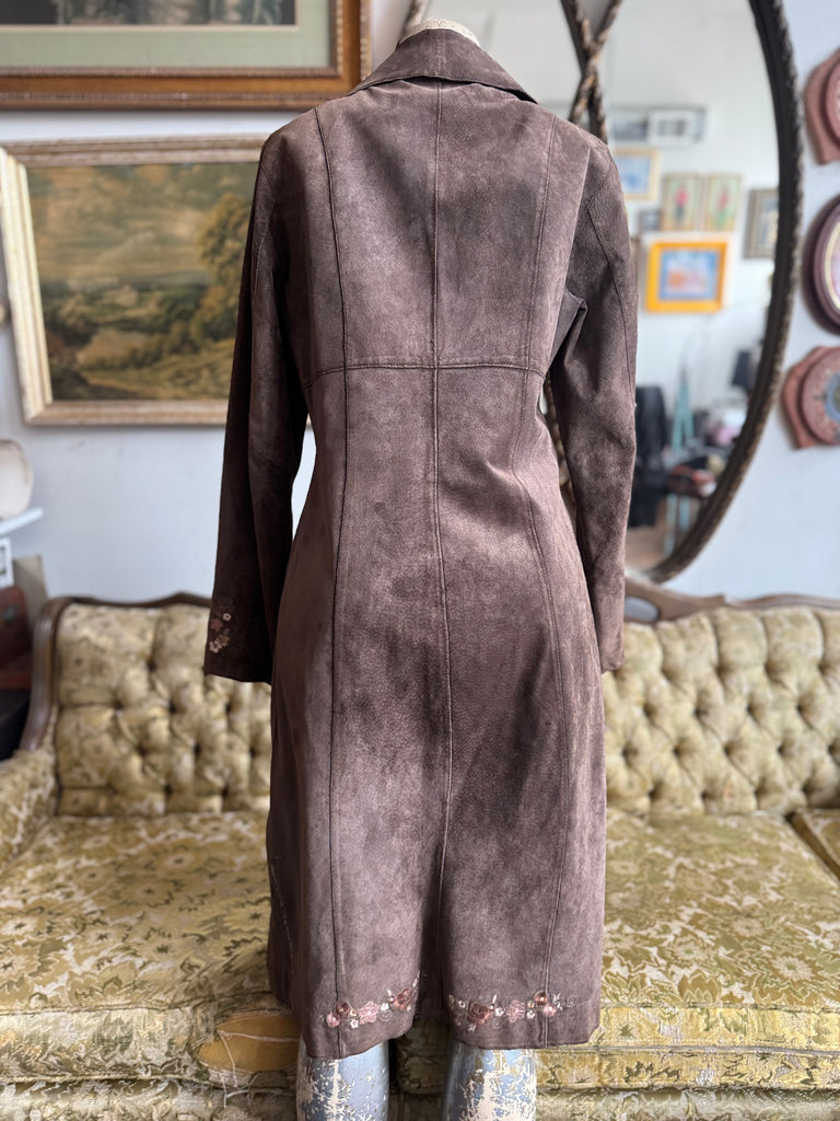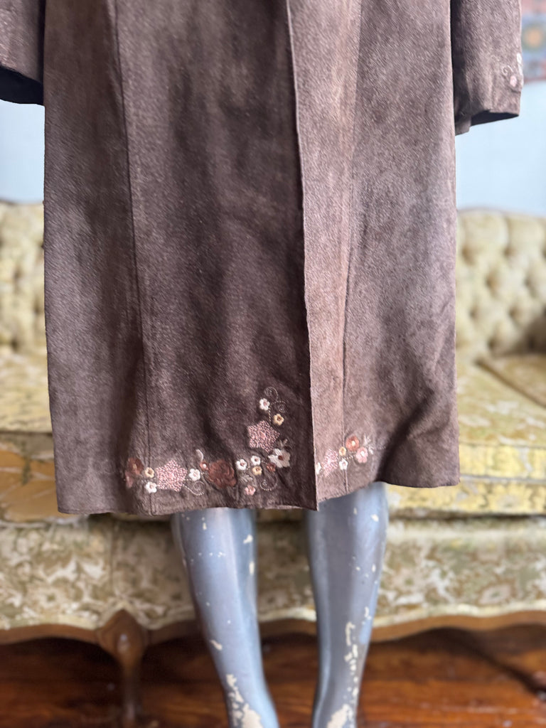 Brown leather floral embroidered long coat By Nine West