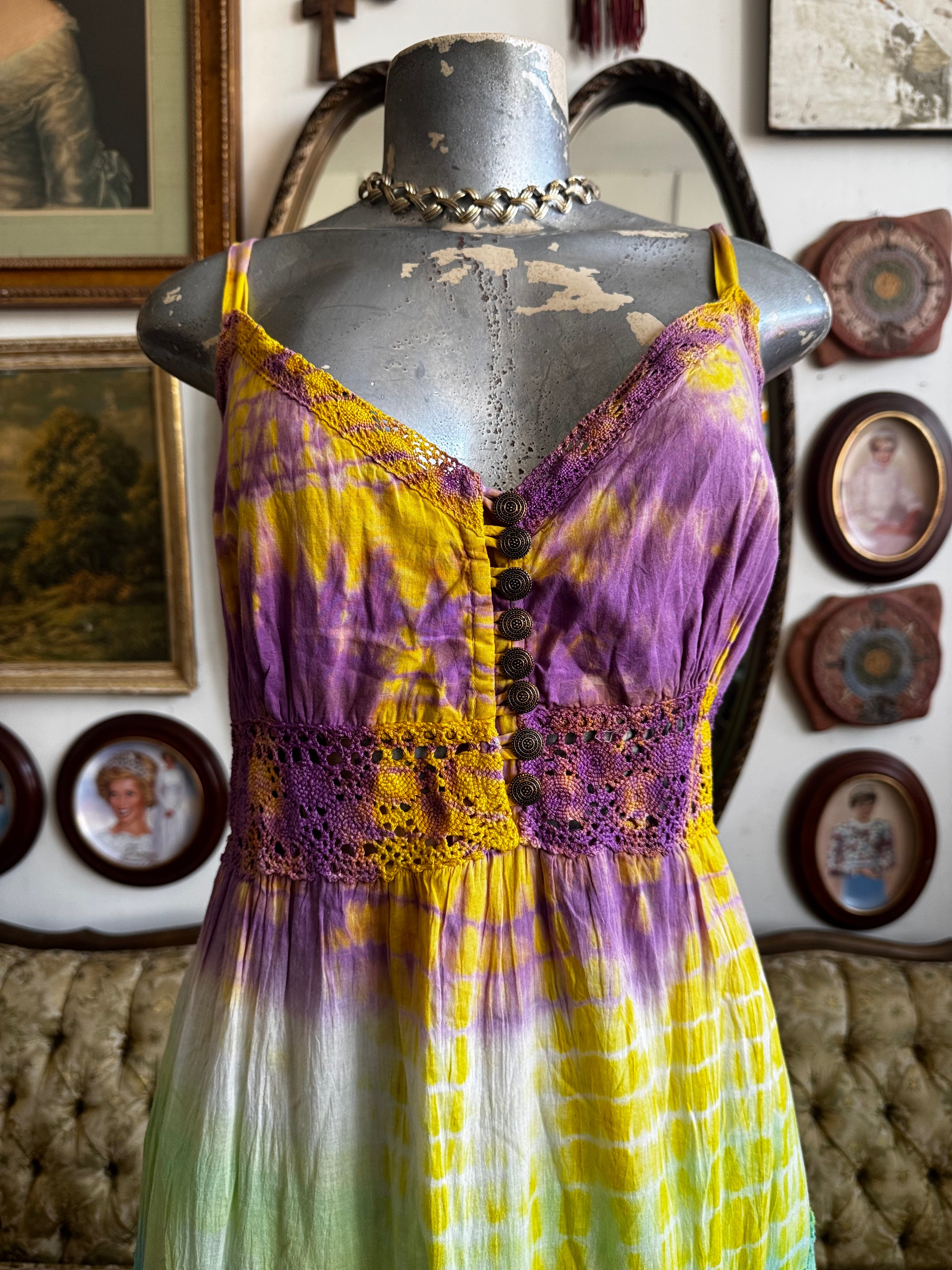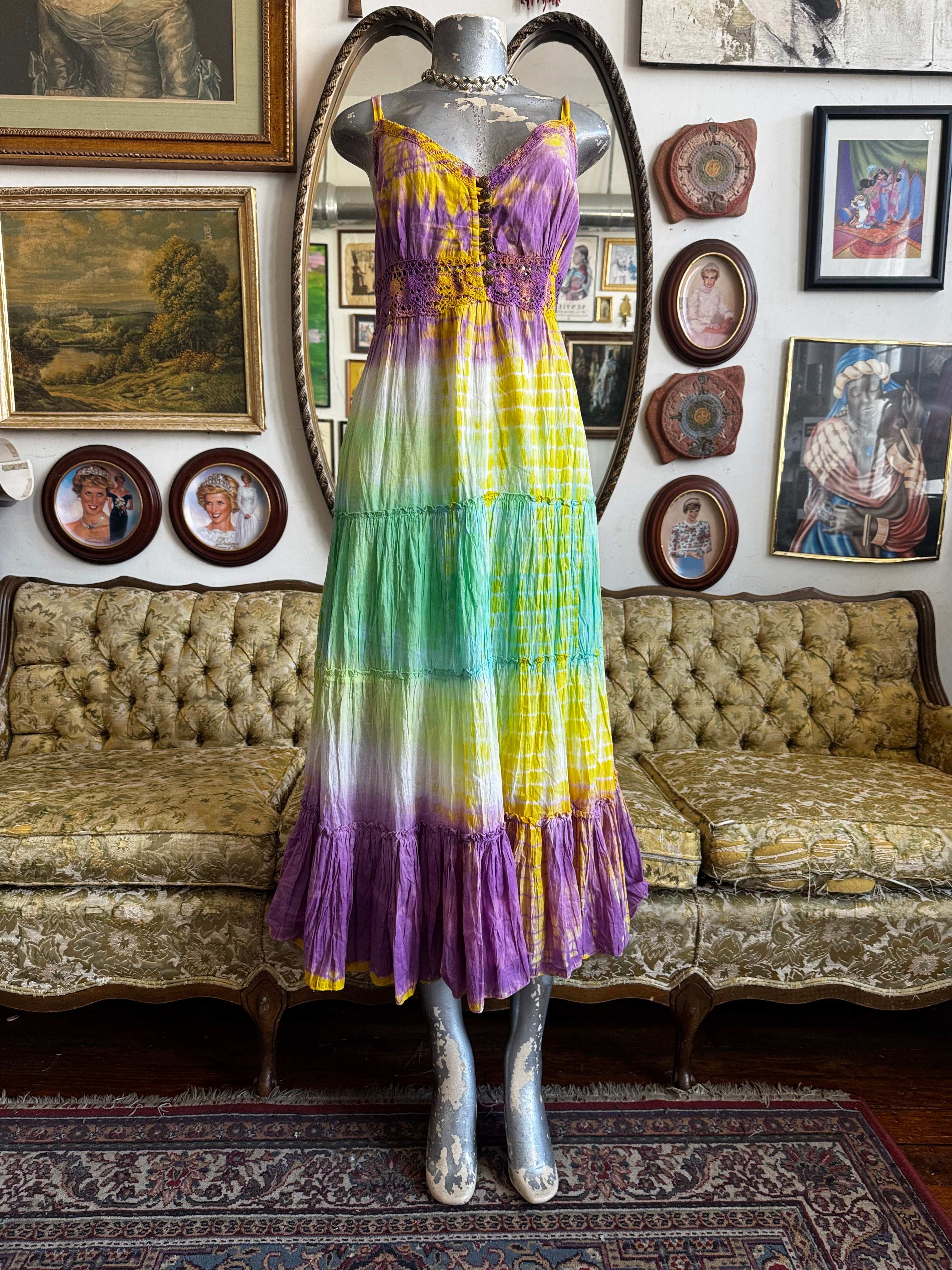 Description: Pastel Tie Dye Tiered Maxi Dress With Adjustable Straps and Crochet Trim