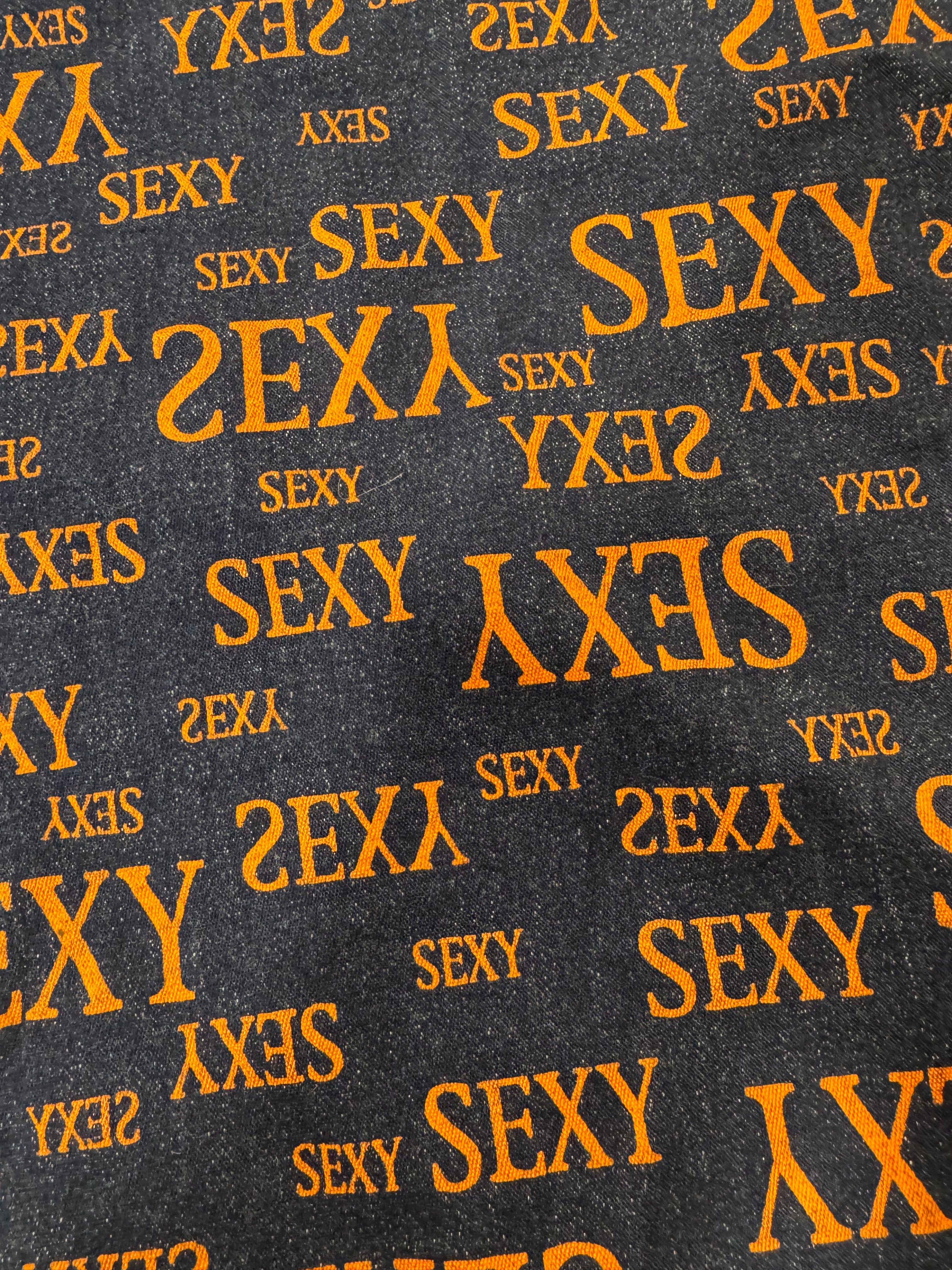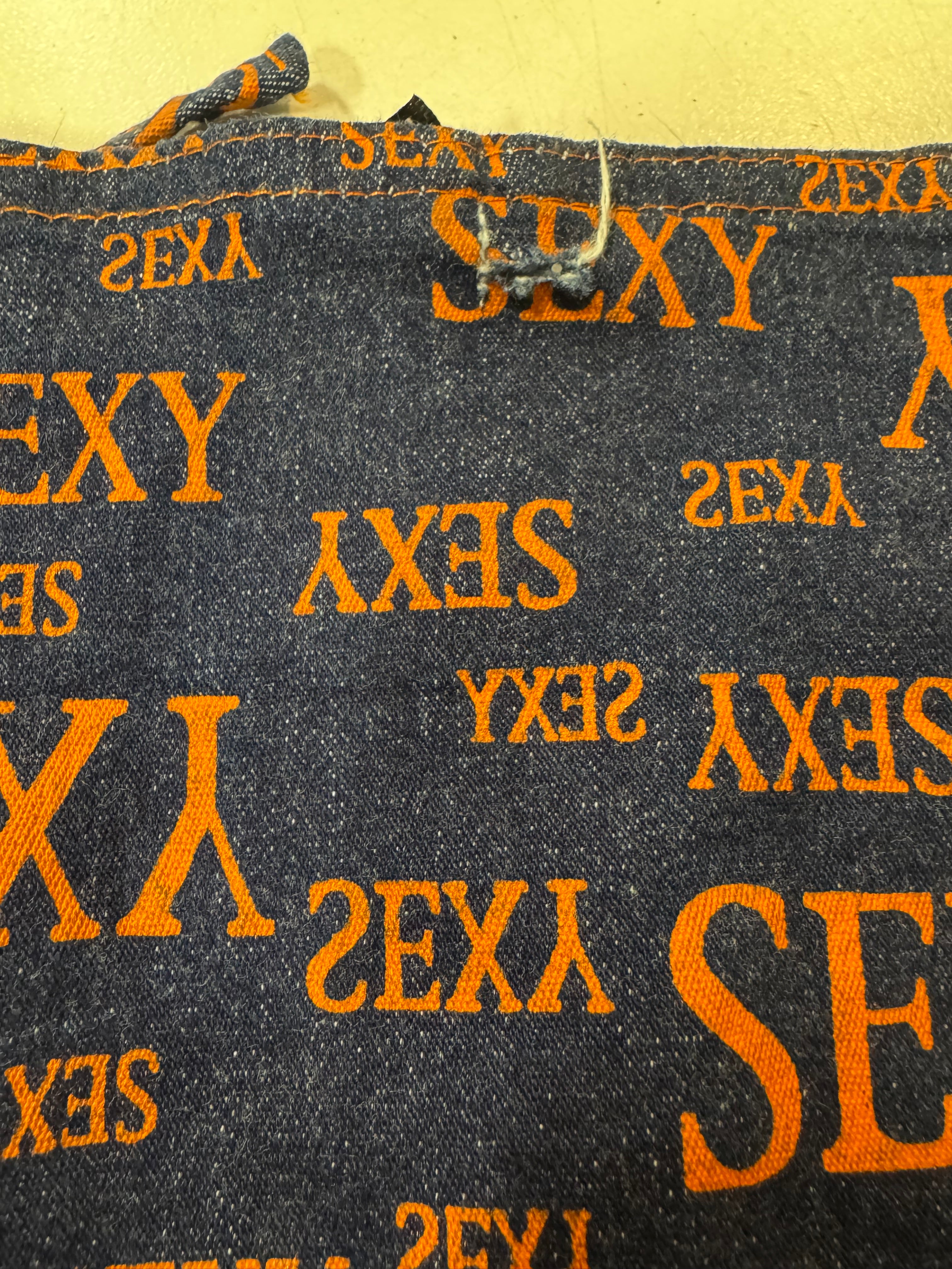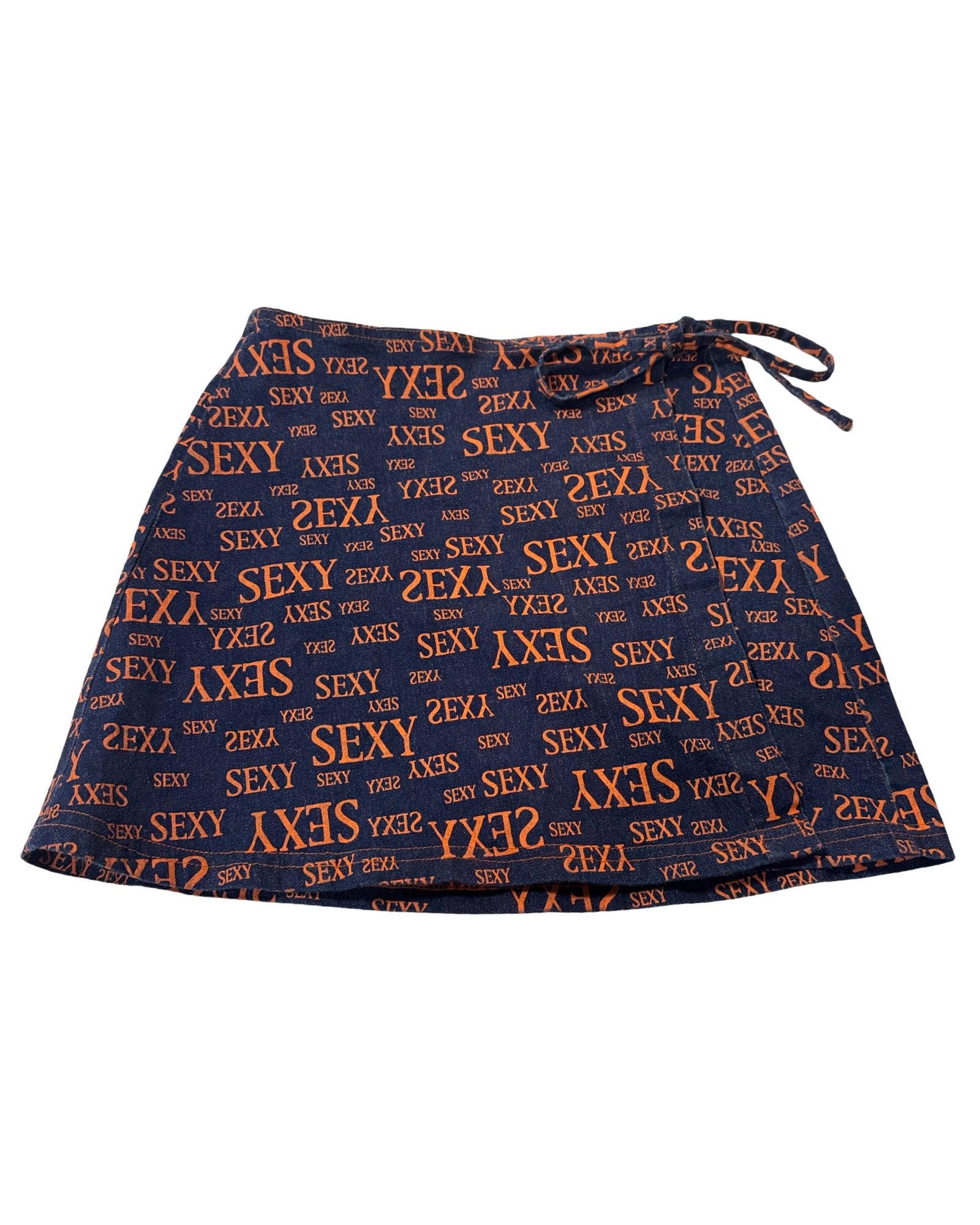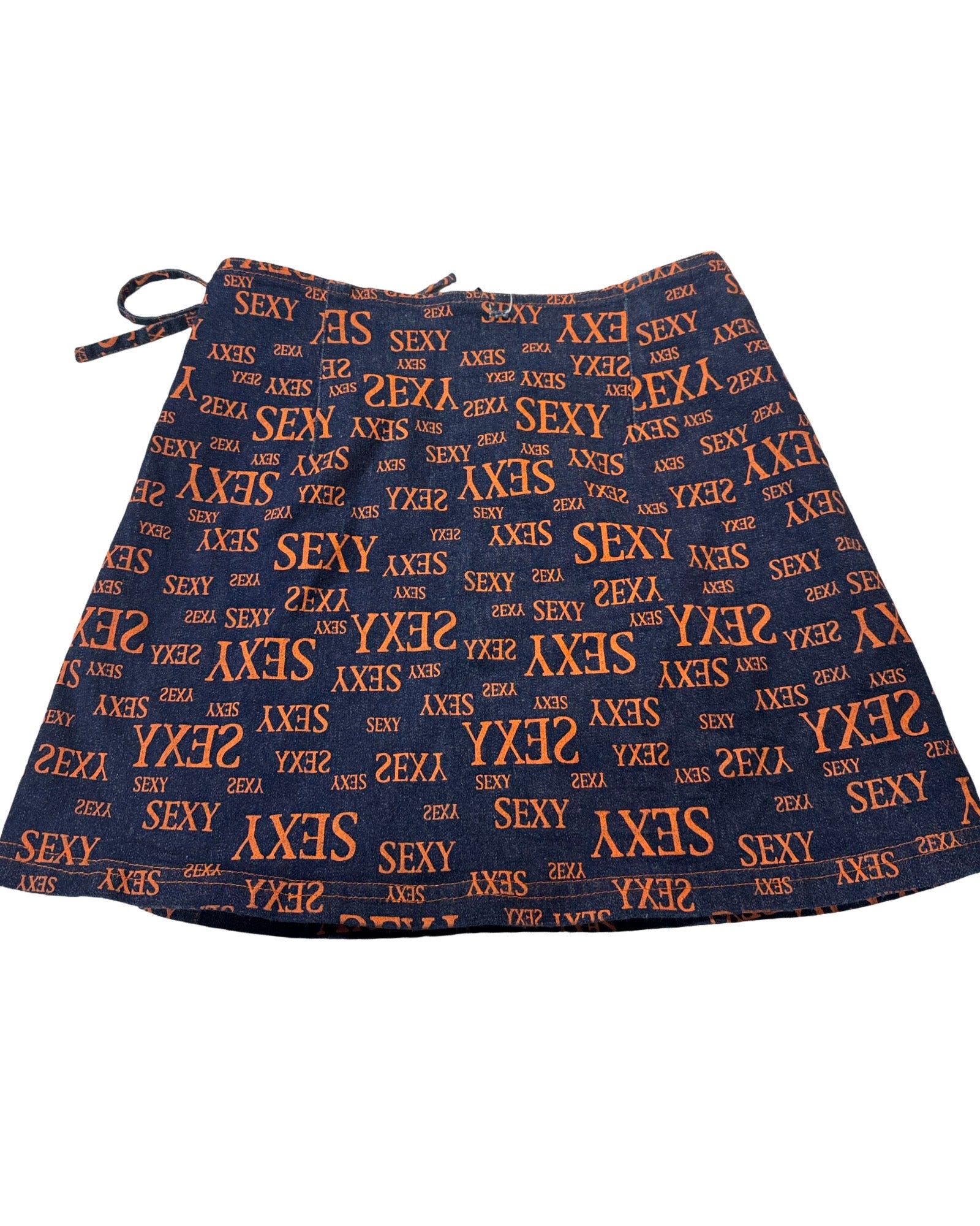 Description: Y2K “SEXY” Graphic Wrap Denim Mini Skirt. SOLD AS IS (SMALL HOLE)