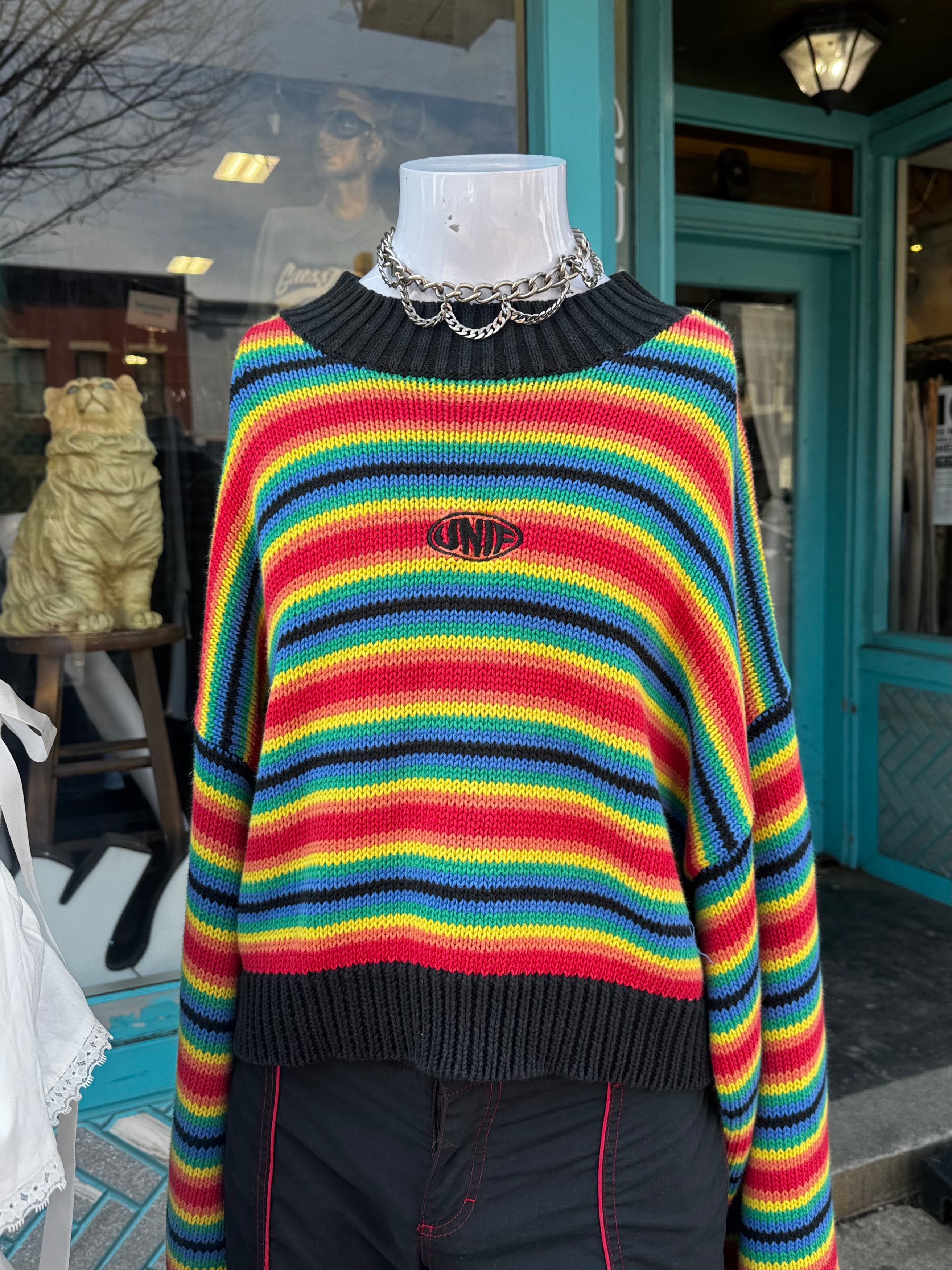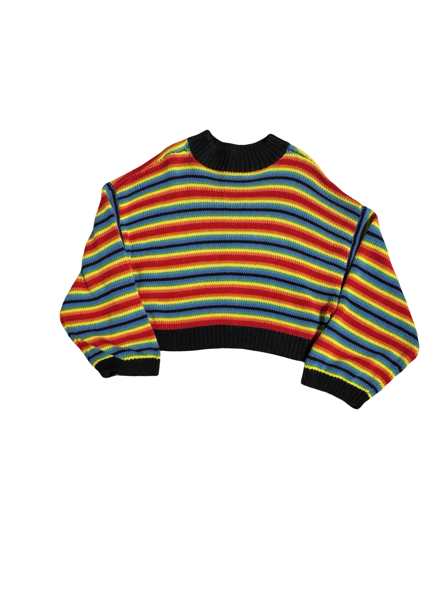 Description: Rainbow Striped Unif Knit Sweater featuring a cropped oversized fit.