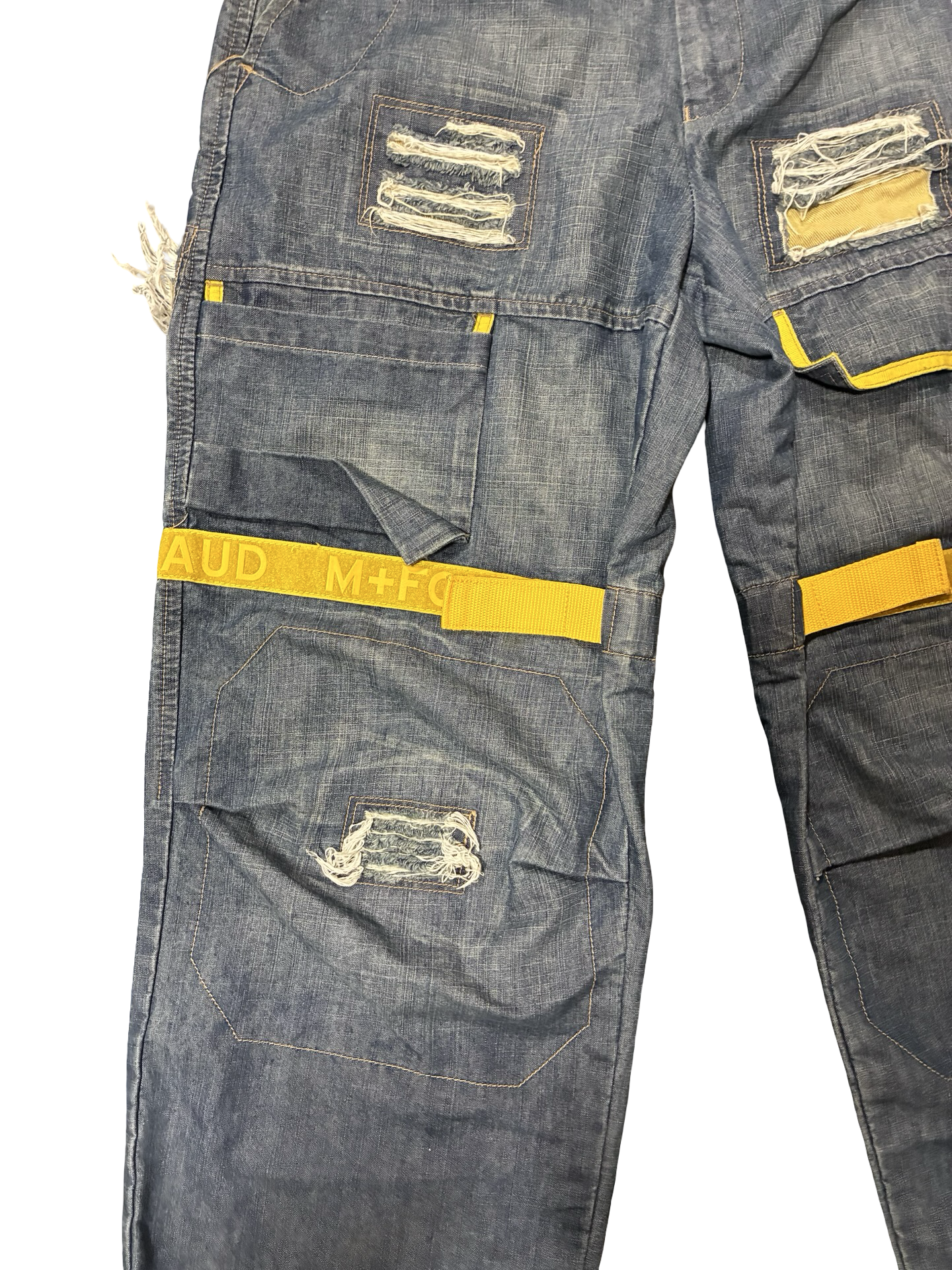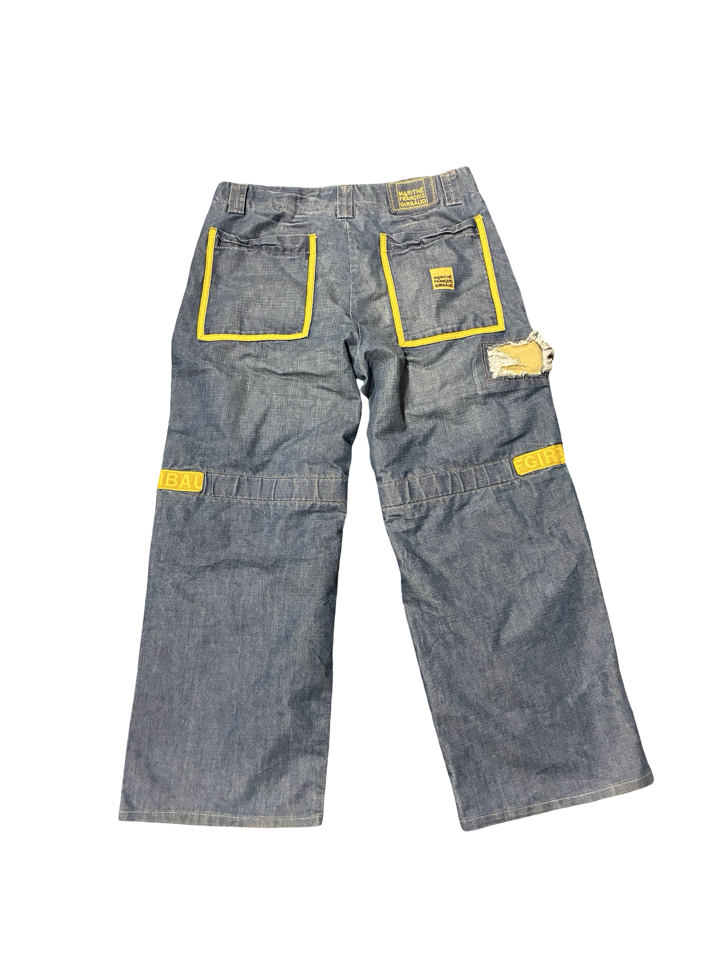 Description:Marithe Francois Girbaud Distressed Carpenter Jeans, featuring yellow detailing.