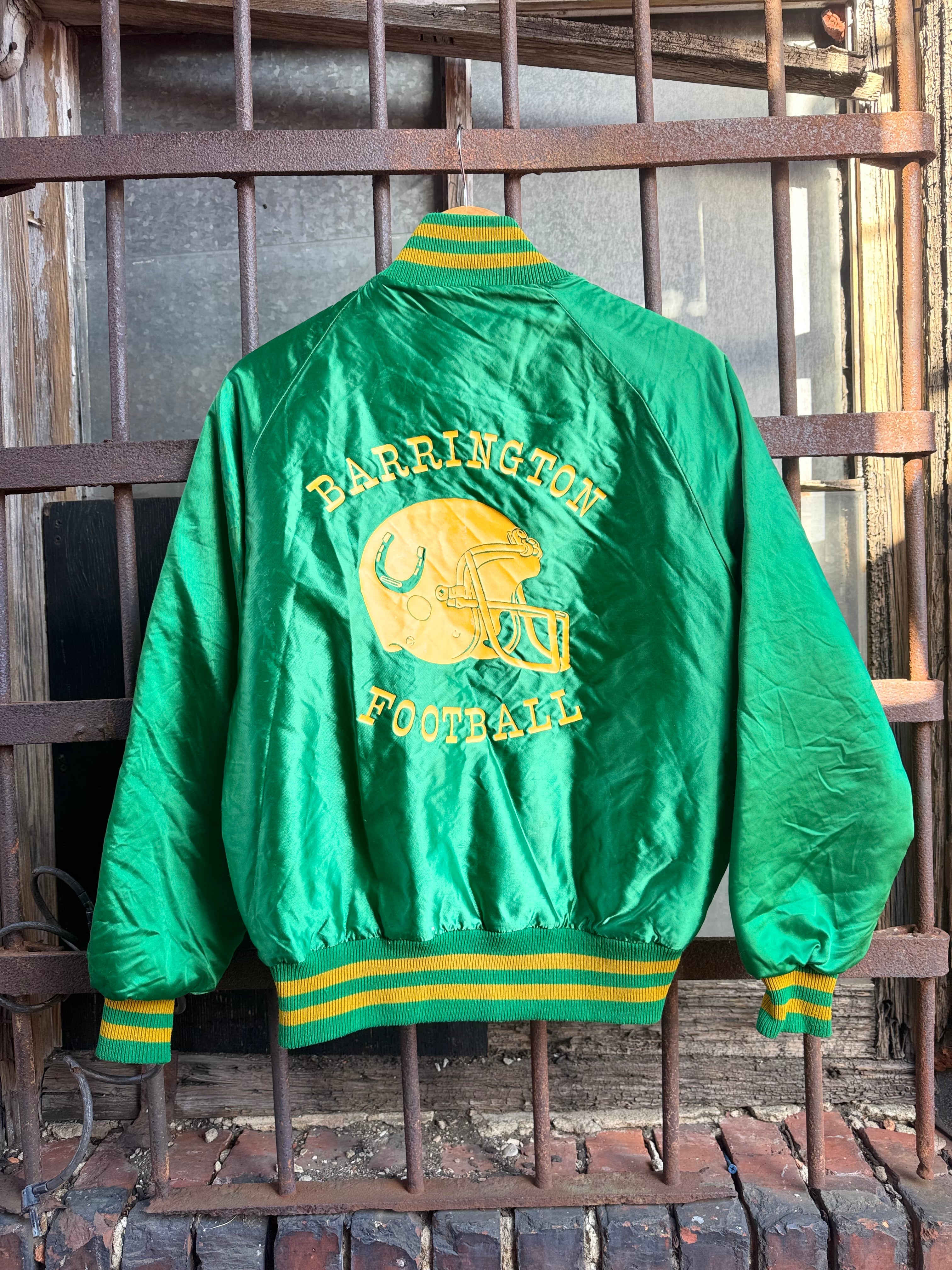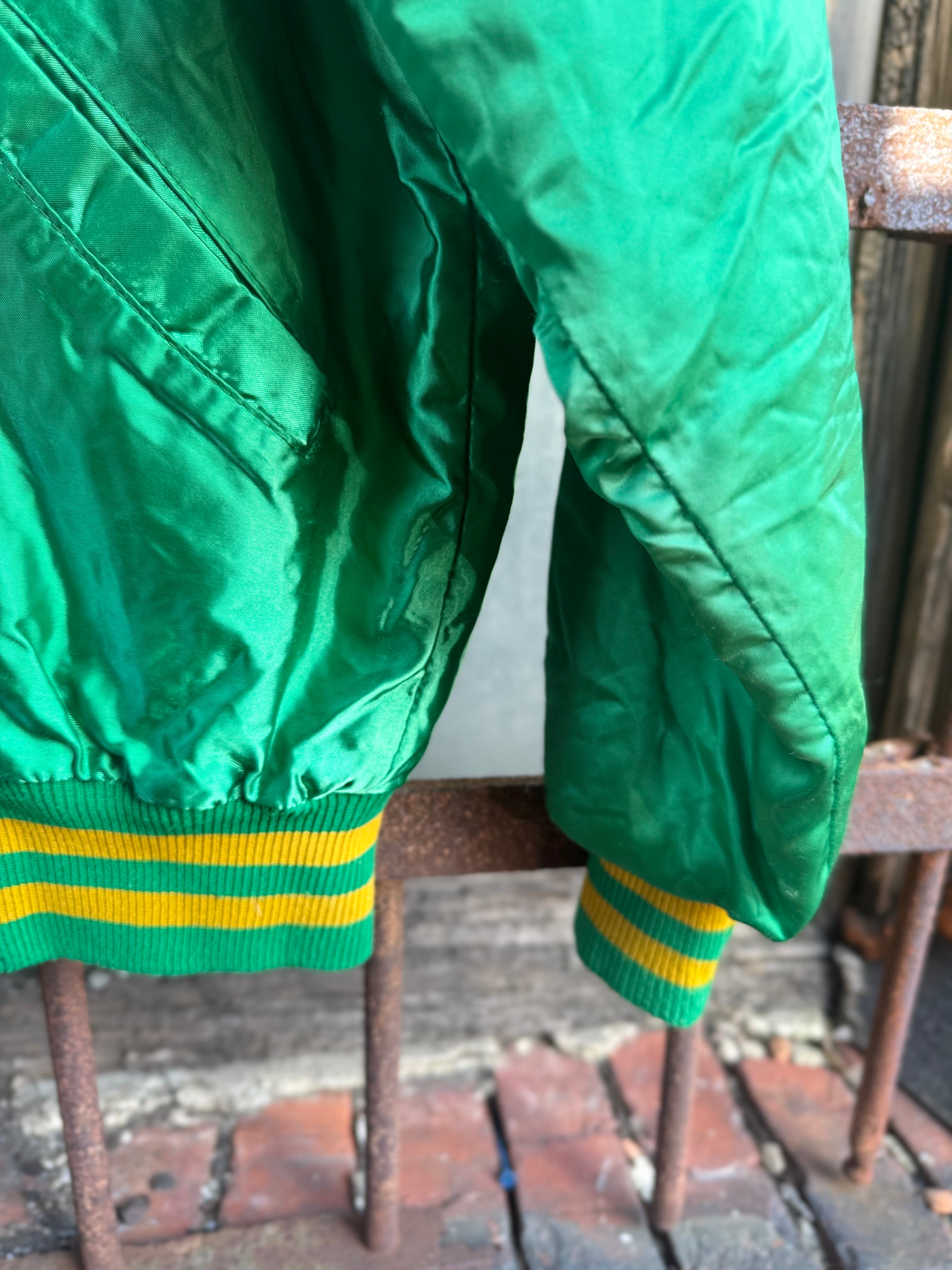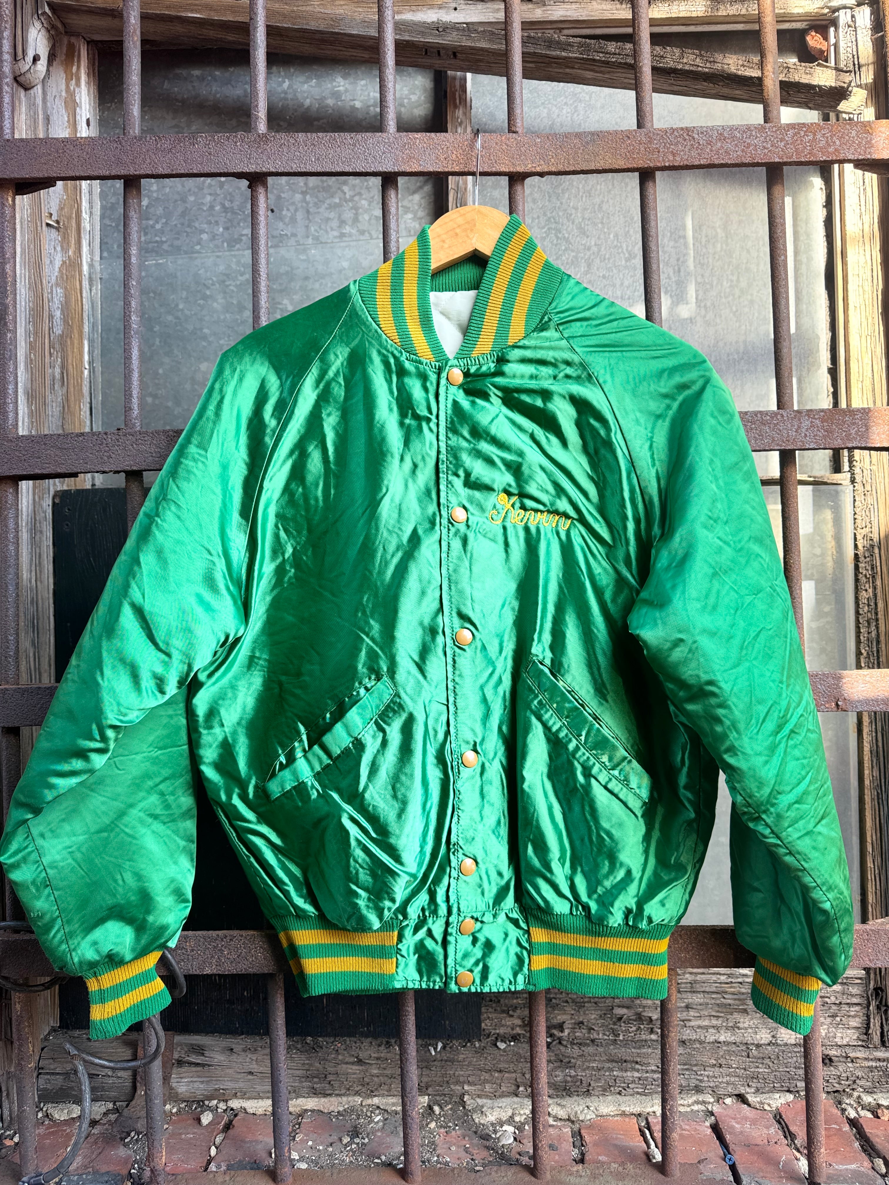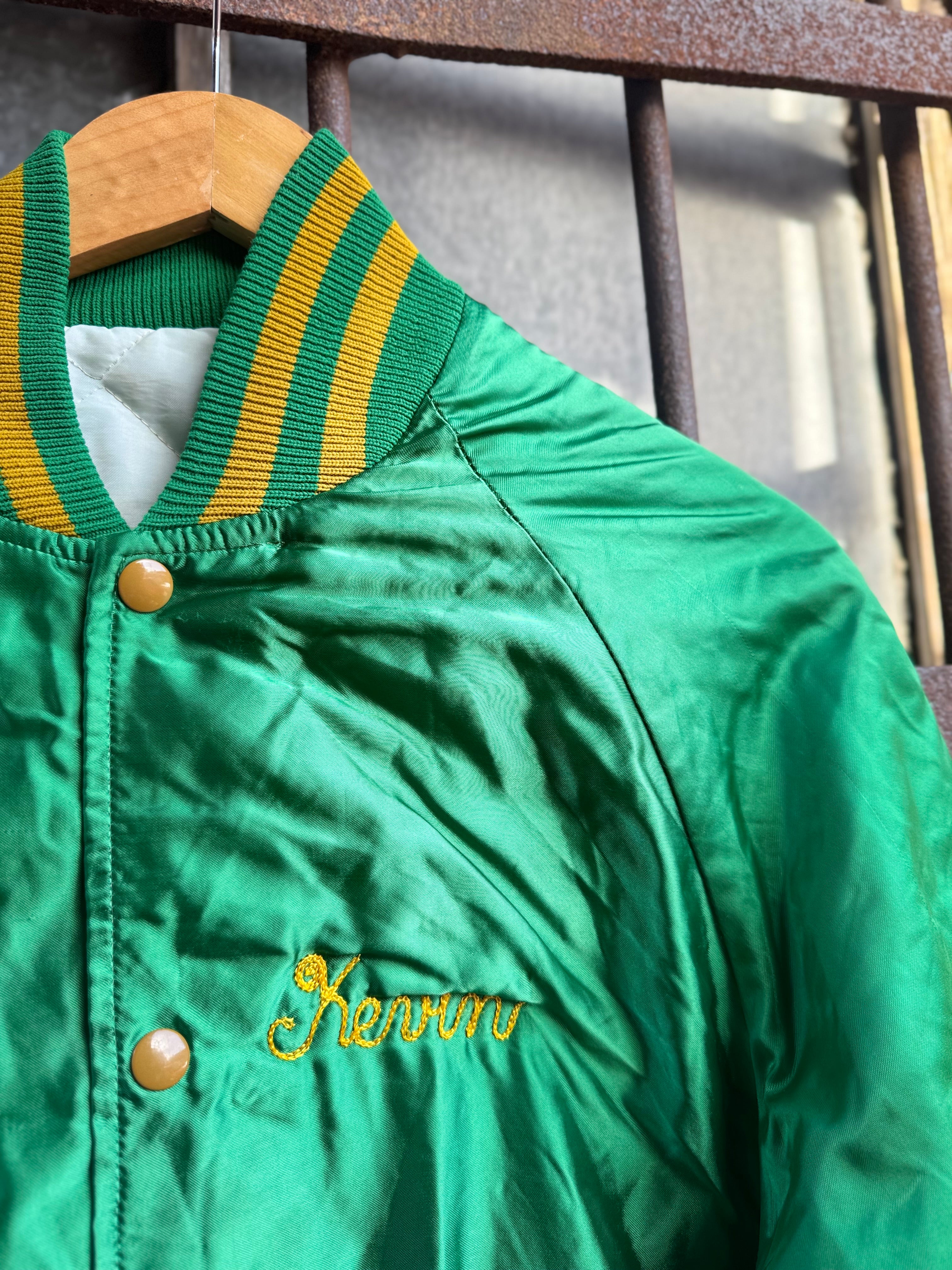 Vintage 80s “Kevin” Green & Yellow Satin Football Varsity Bomber Jacket Size S