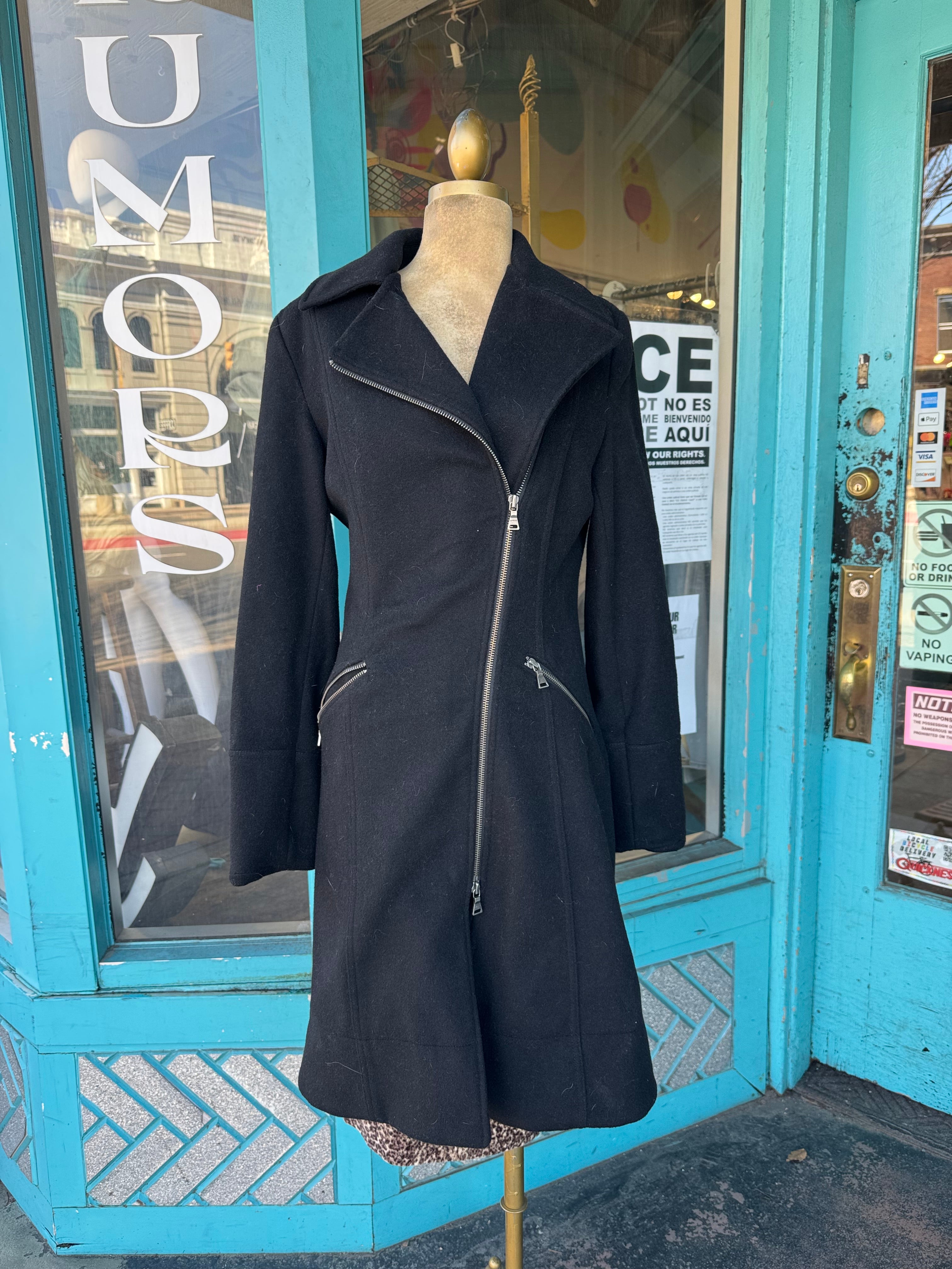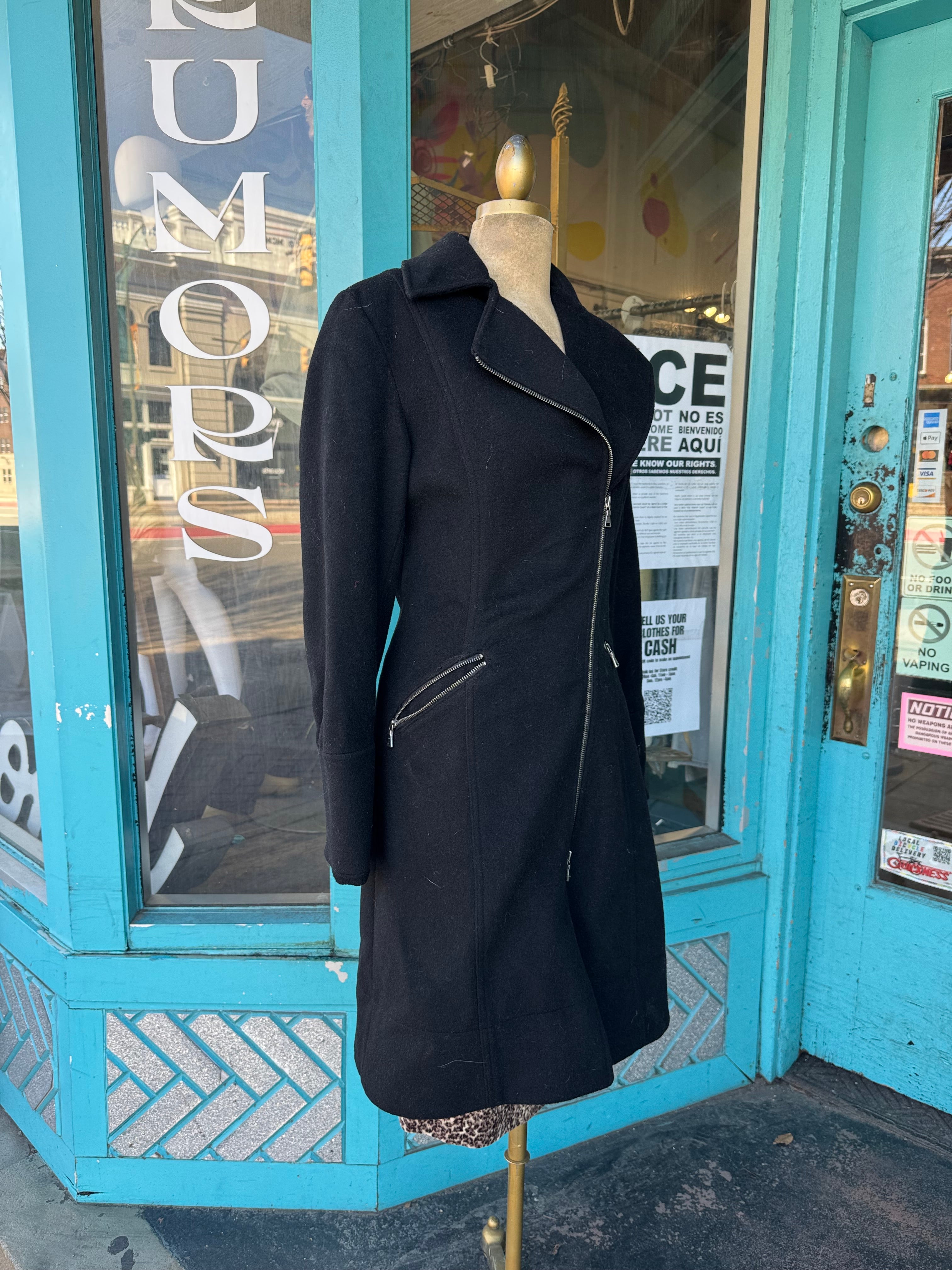 Description: Express Wool Lace Back Coat WIth Asymmetrical Two Way Zipper