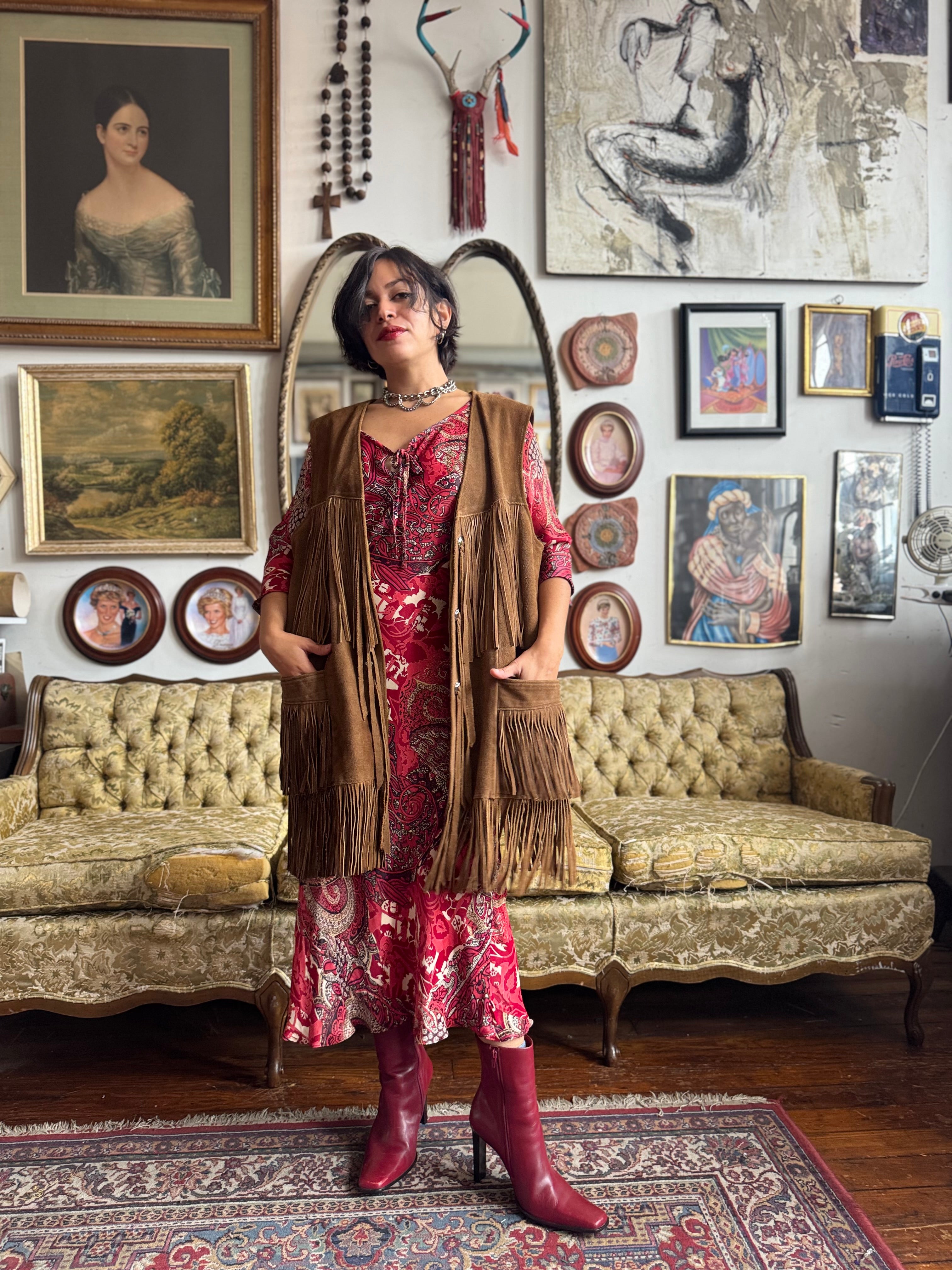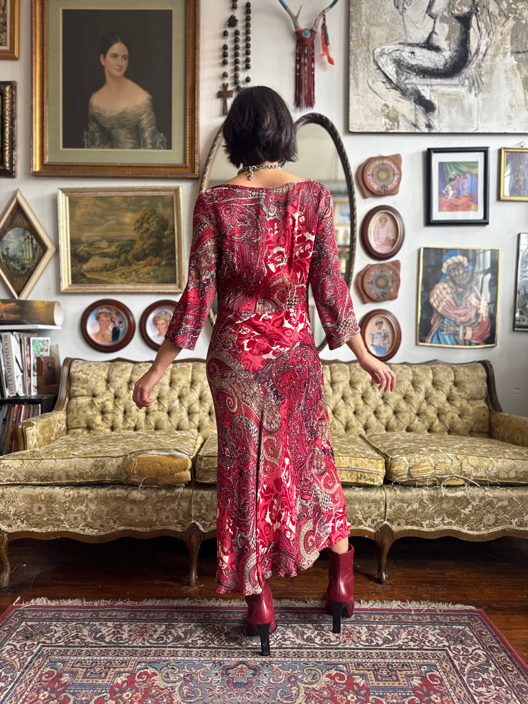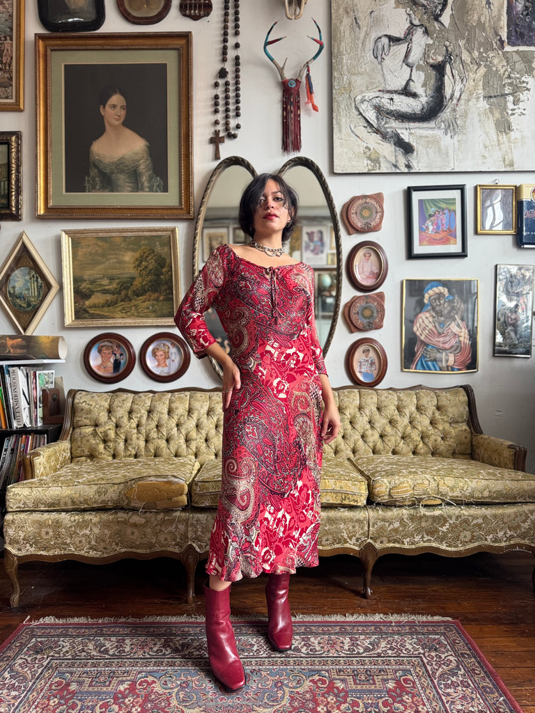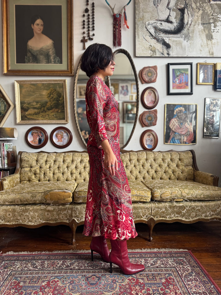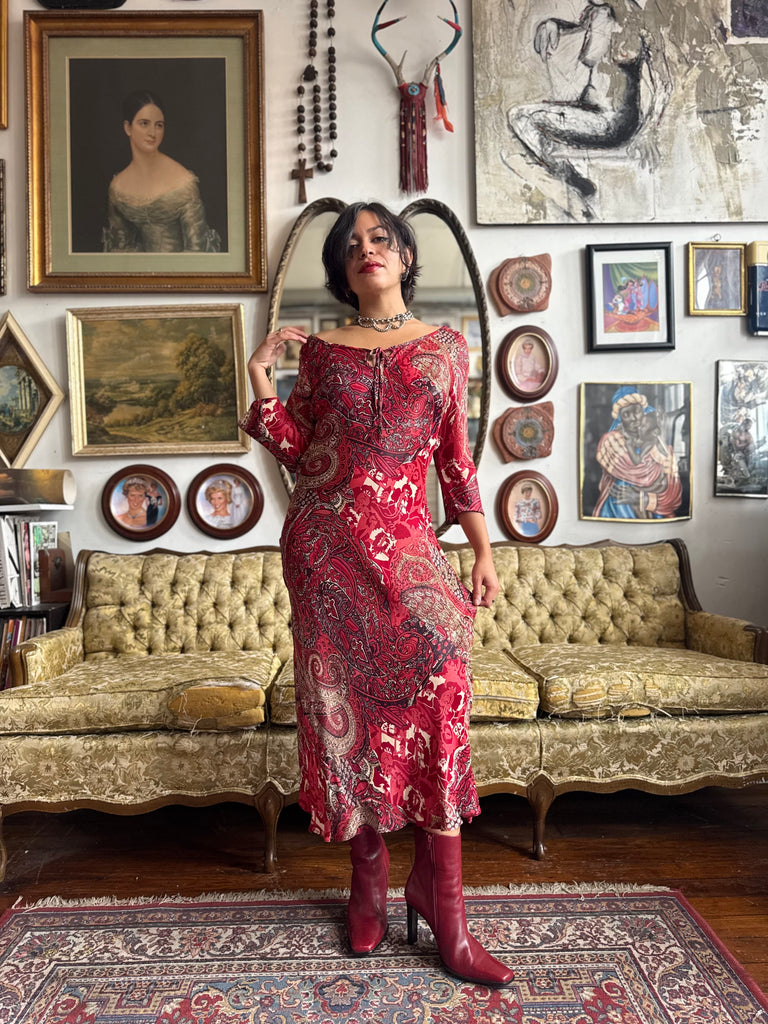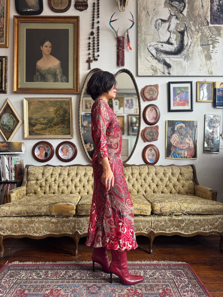 Y2K Cranberry Paisley Bodycon Long Sleeve Dress Size Medium