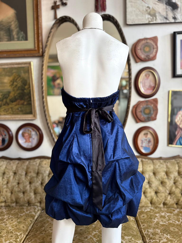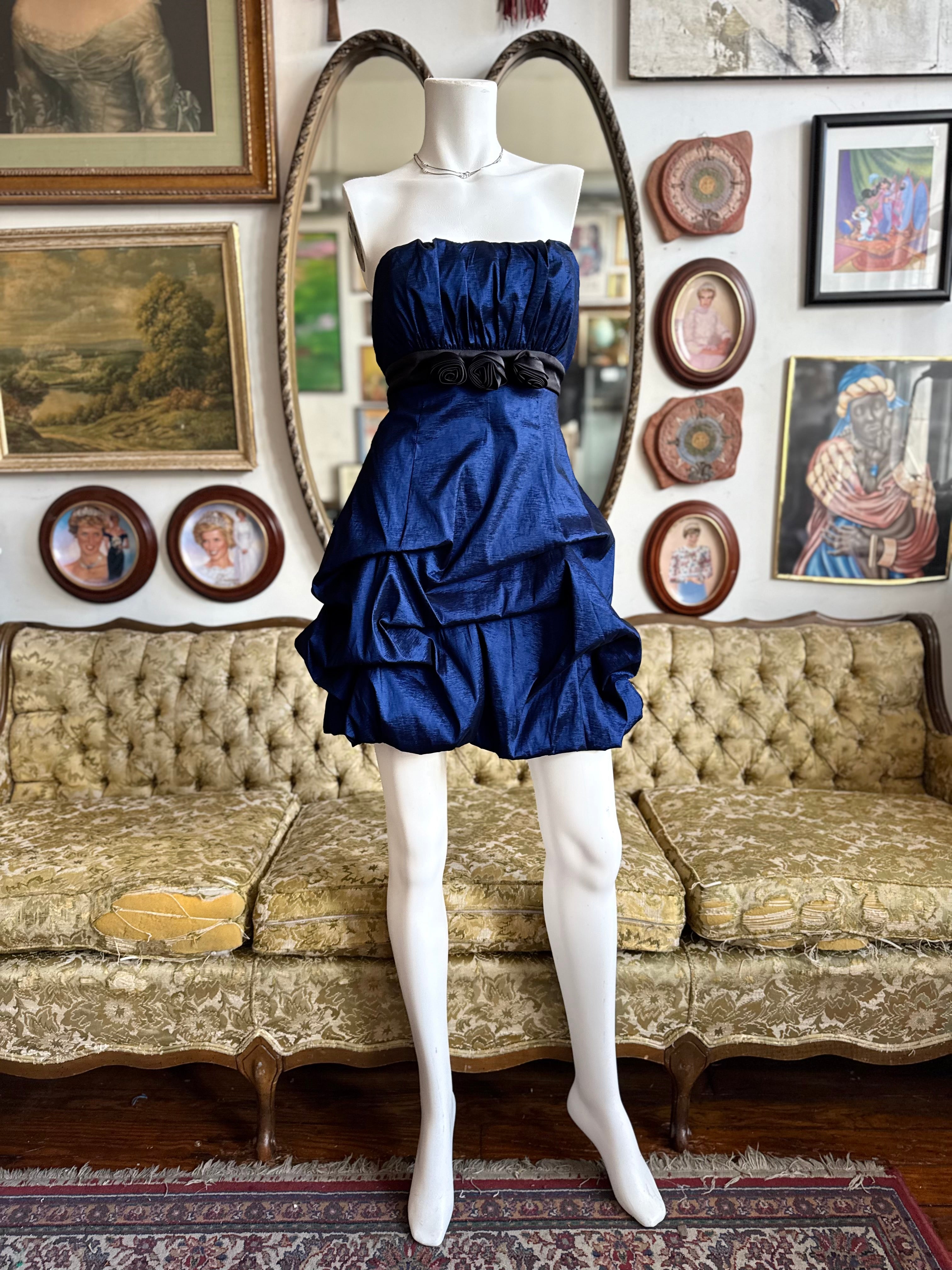 Y2K royal blue ruched party dress featuring black rosettes.
