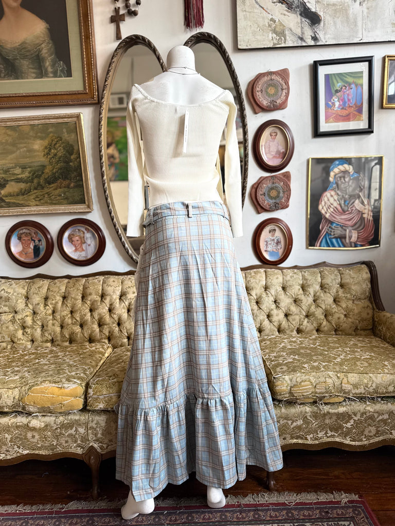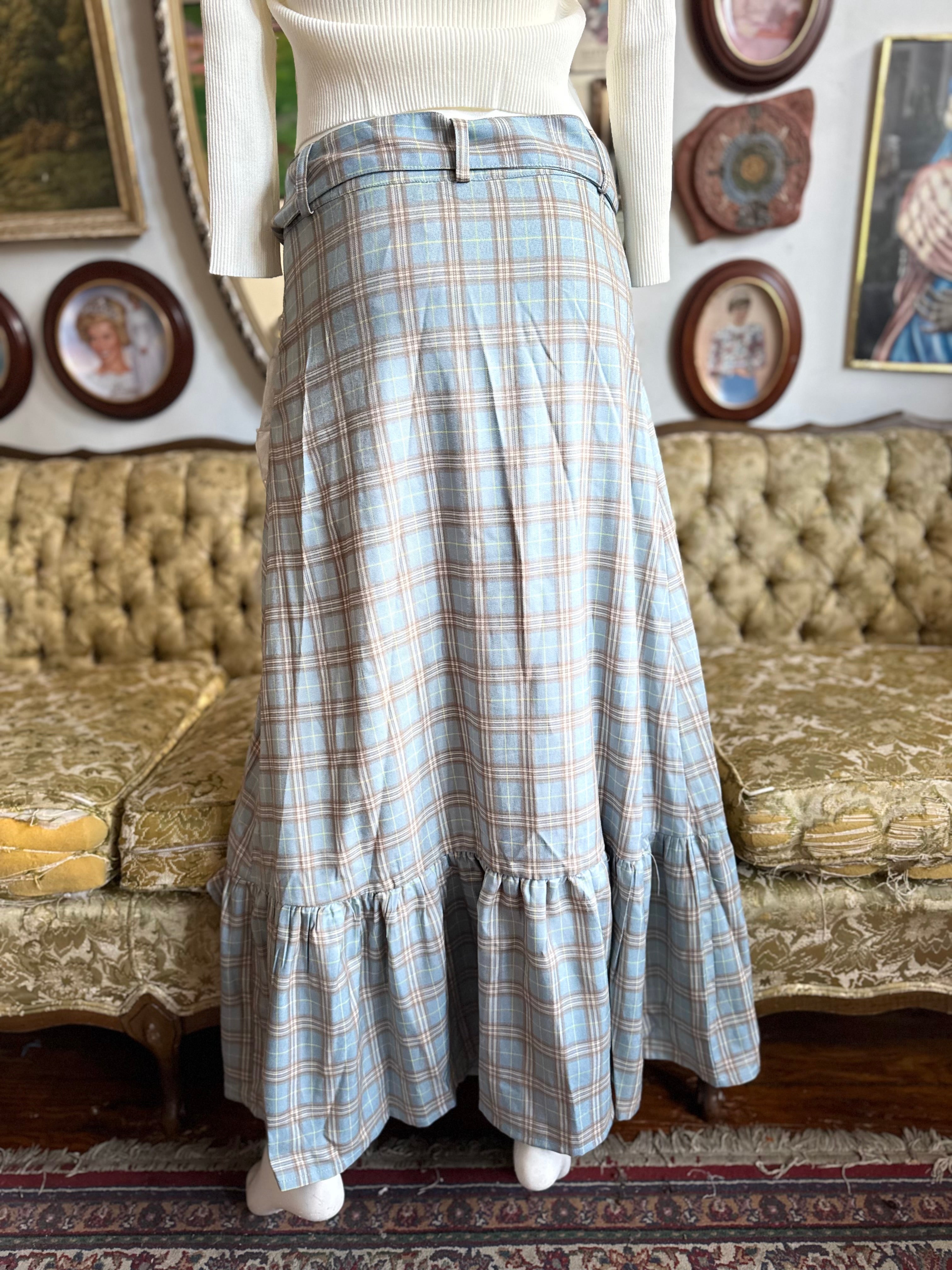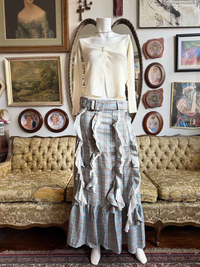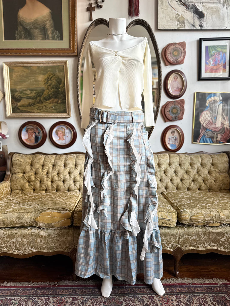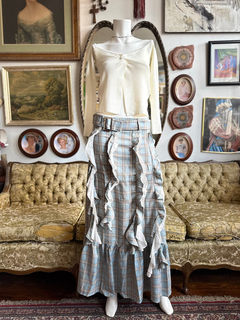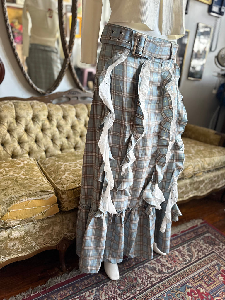 Blue Plaid Maxi Skirt Featuring Lace Detailing.