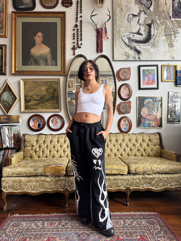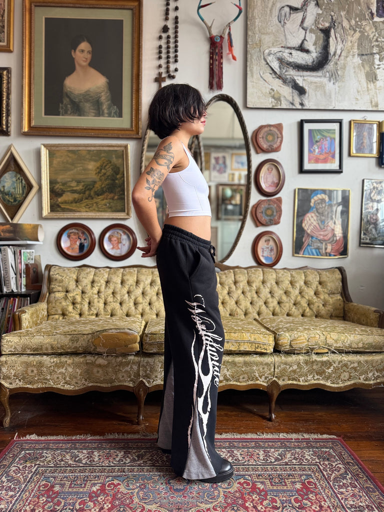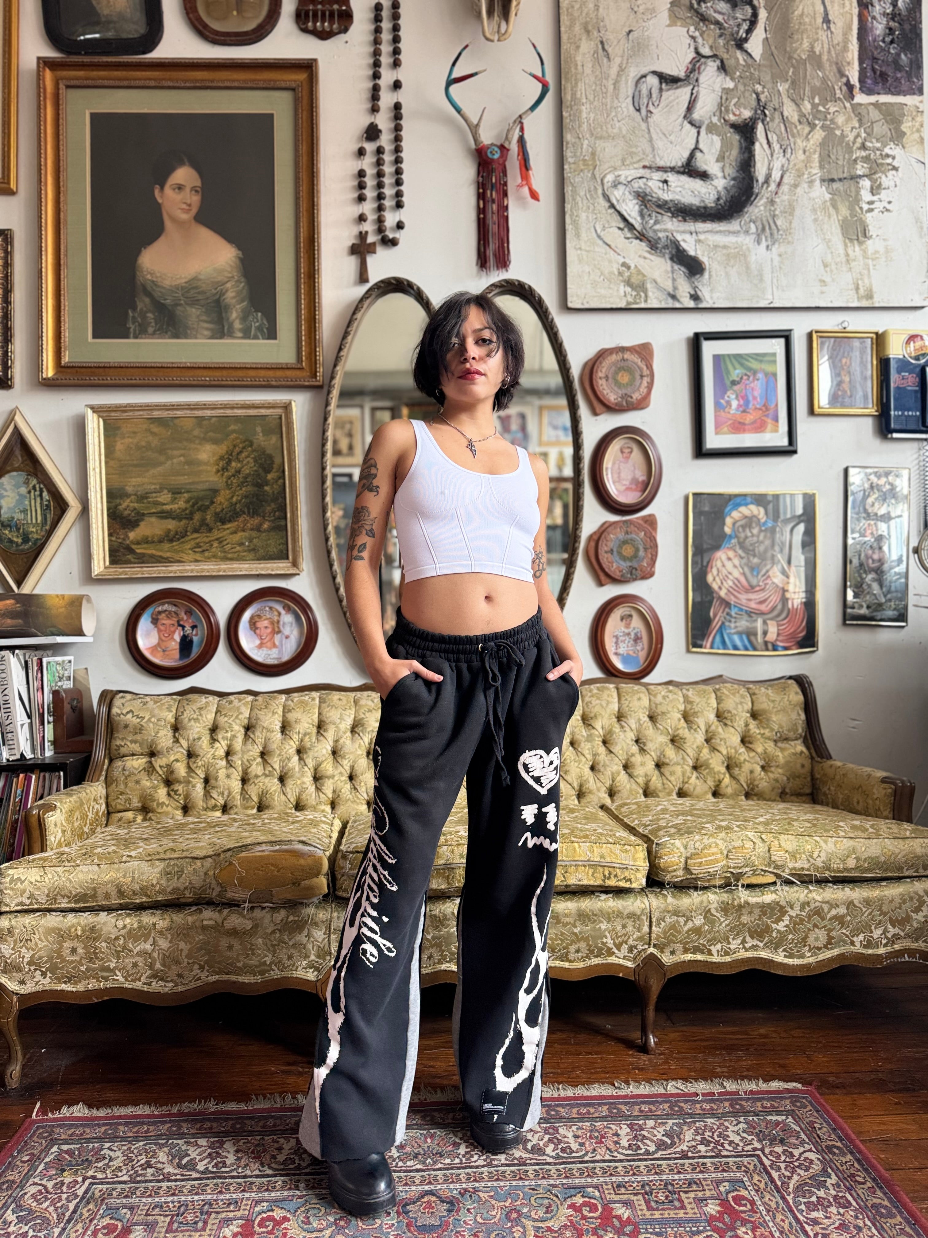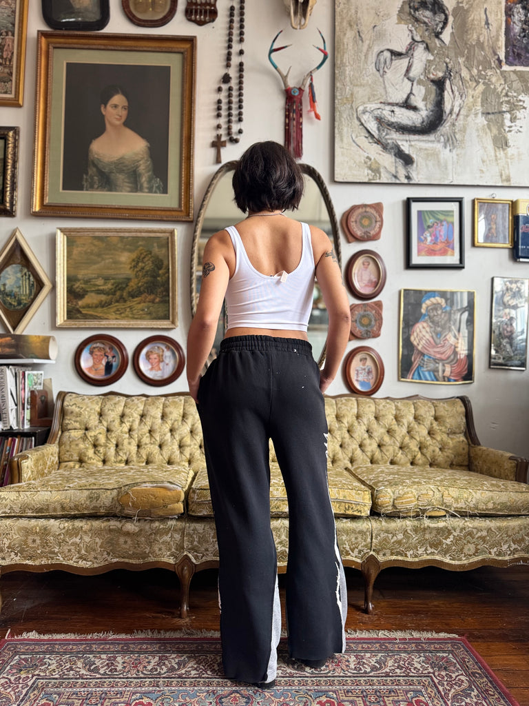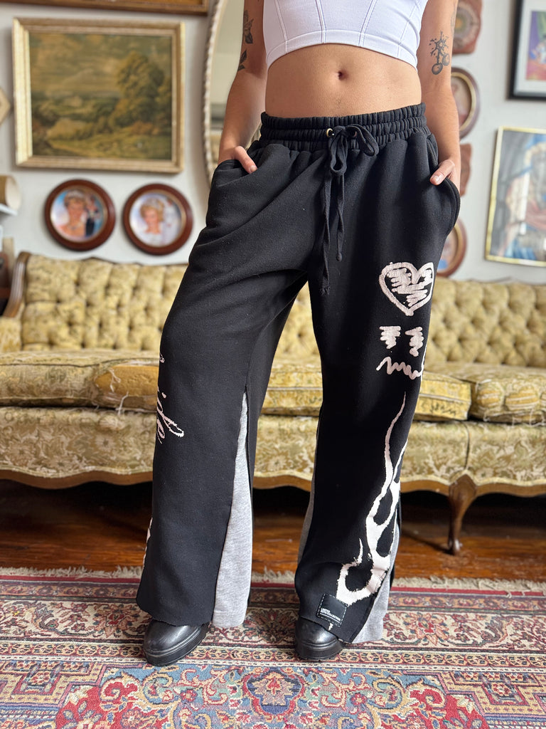 Black Punk Painted Graffiti Drawstring Sweatpants w Grey Unhemmed Triangle Inserts Ladies Size L/30