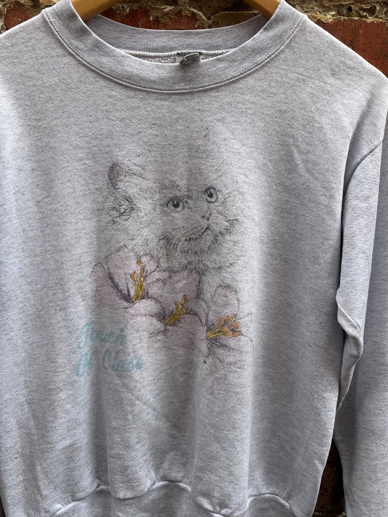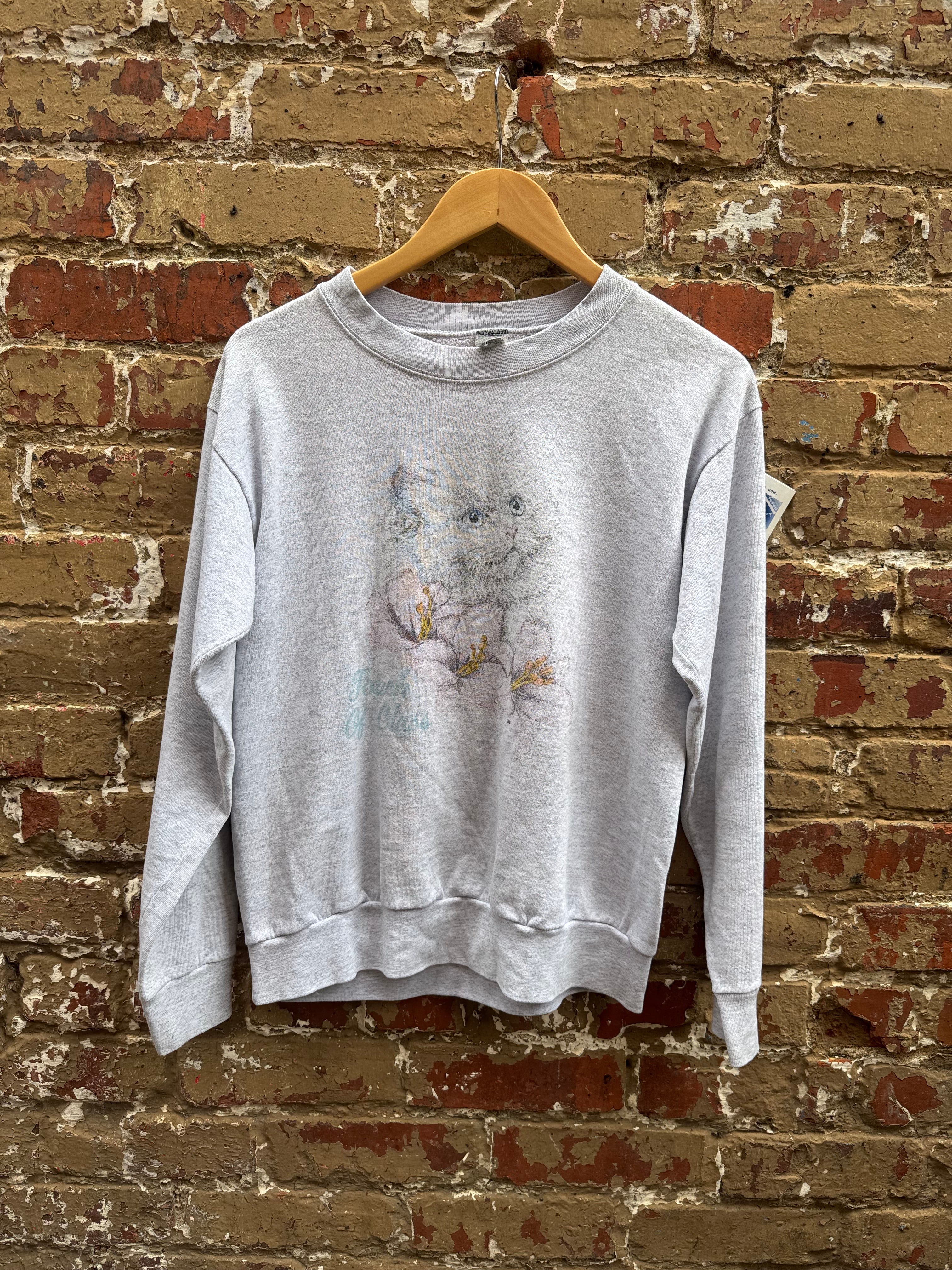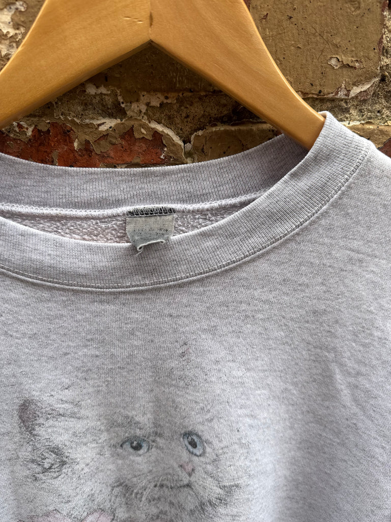 This vintage cat crewneck in a size medium features a super soft faded print that provides a comfortable and unique look. Made from high-quality materials, this crewneck is perfect for casual wear or lounging around the house. The faded print adds a touch of vintage charm to any outfit.