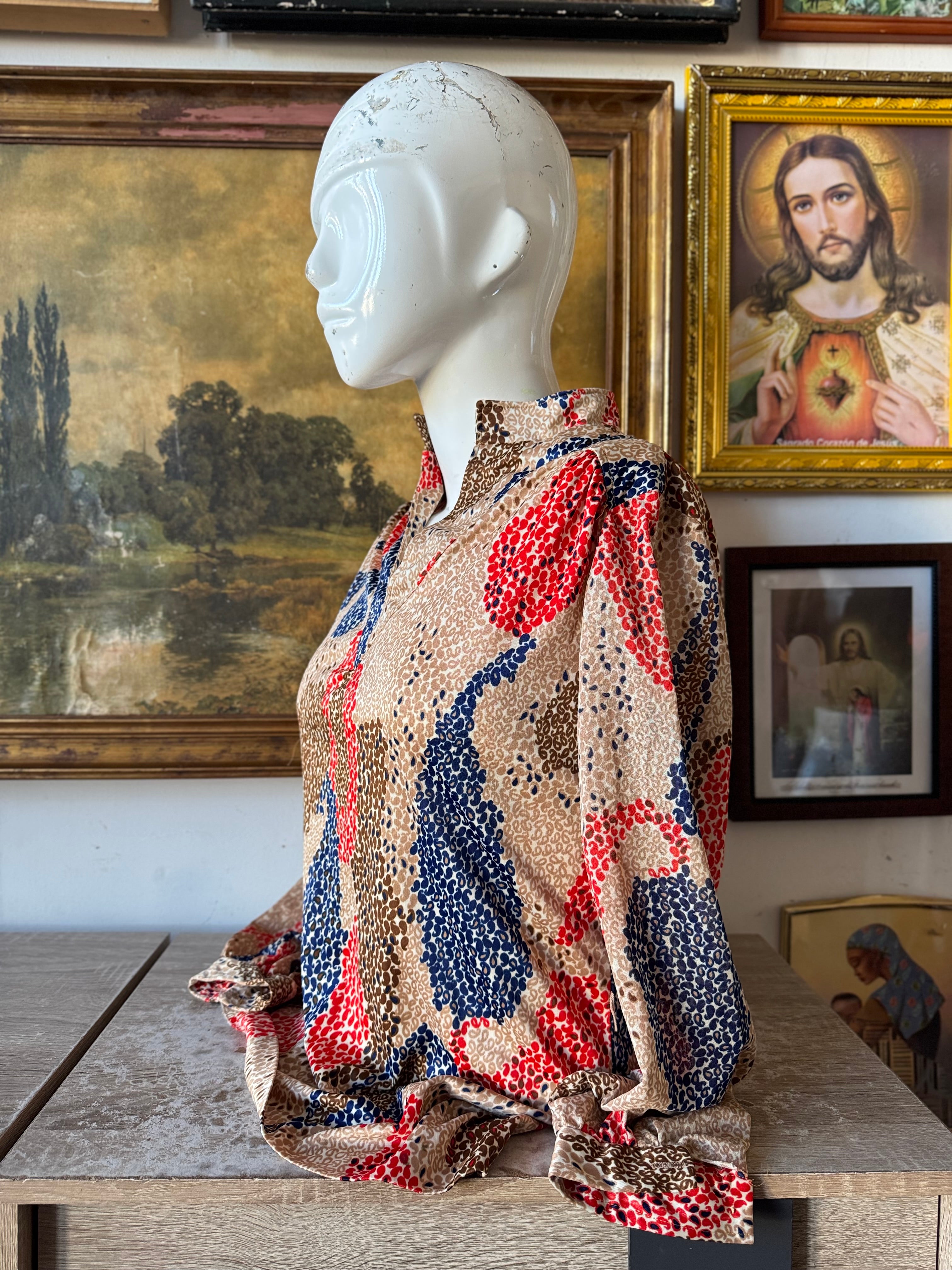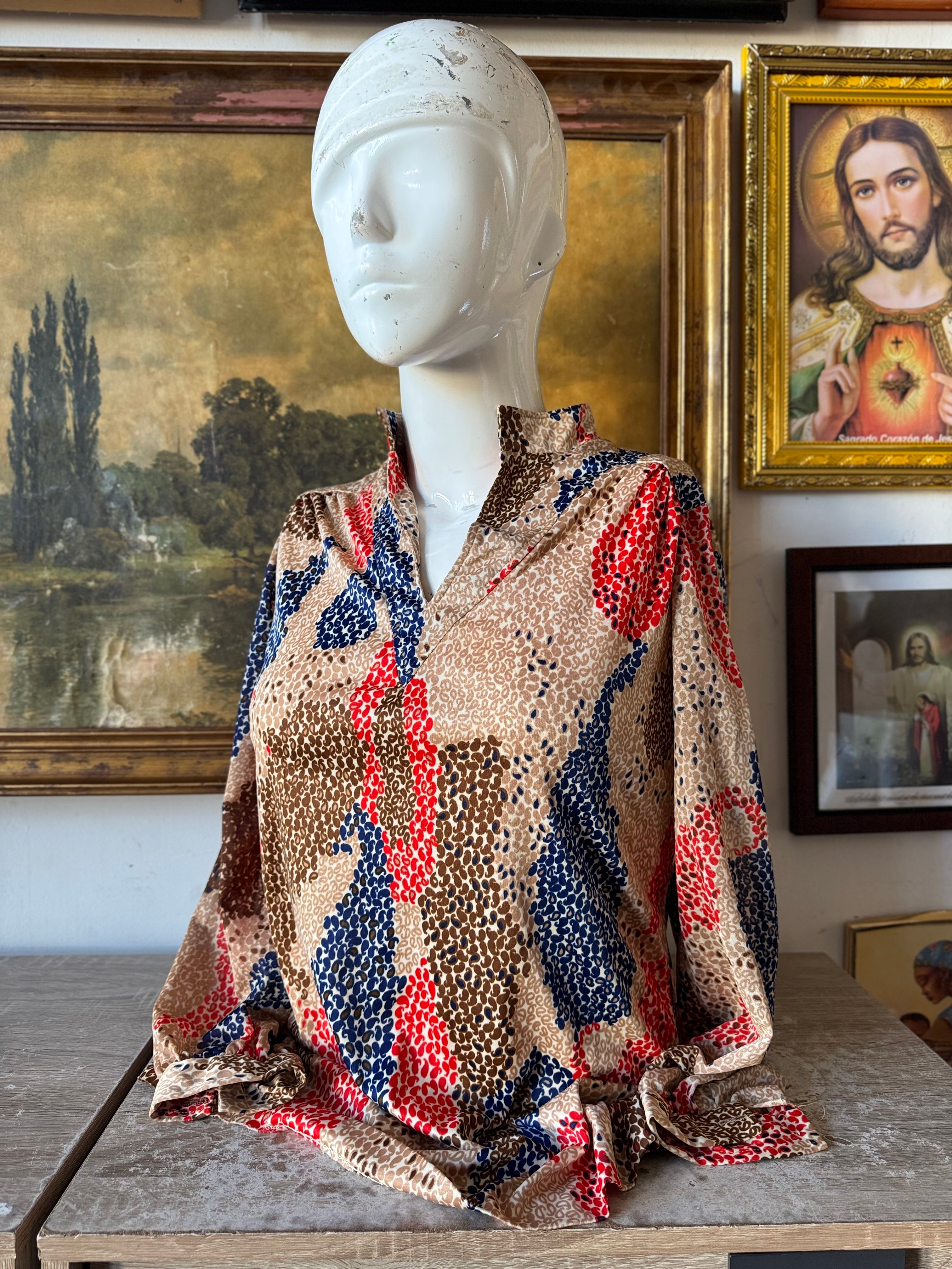 vintage long-sleeved blouse featuring a colorful abstract spotted or "op art" print. The pattern consists of vibrant red and blue textured shapes