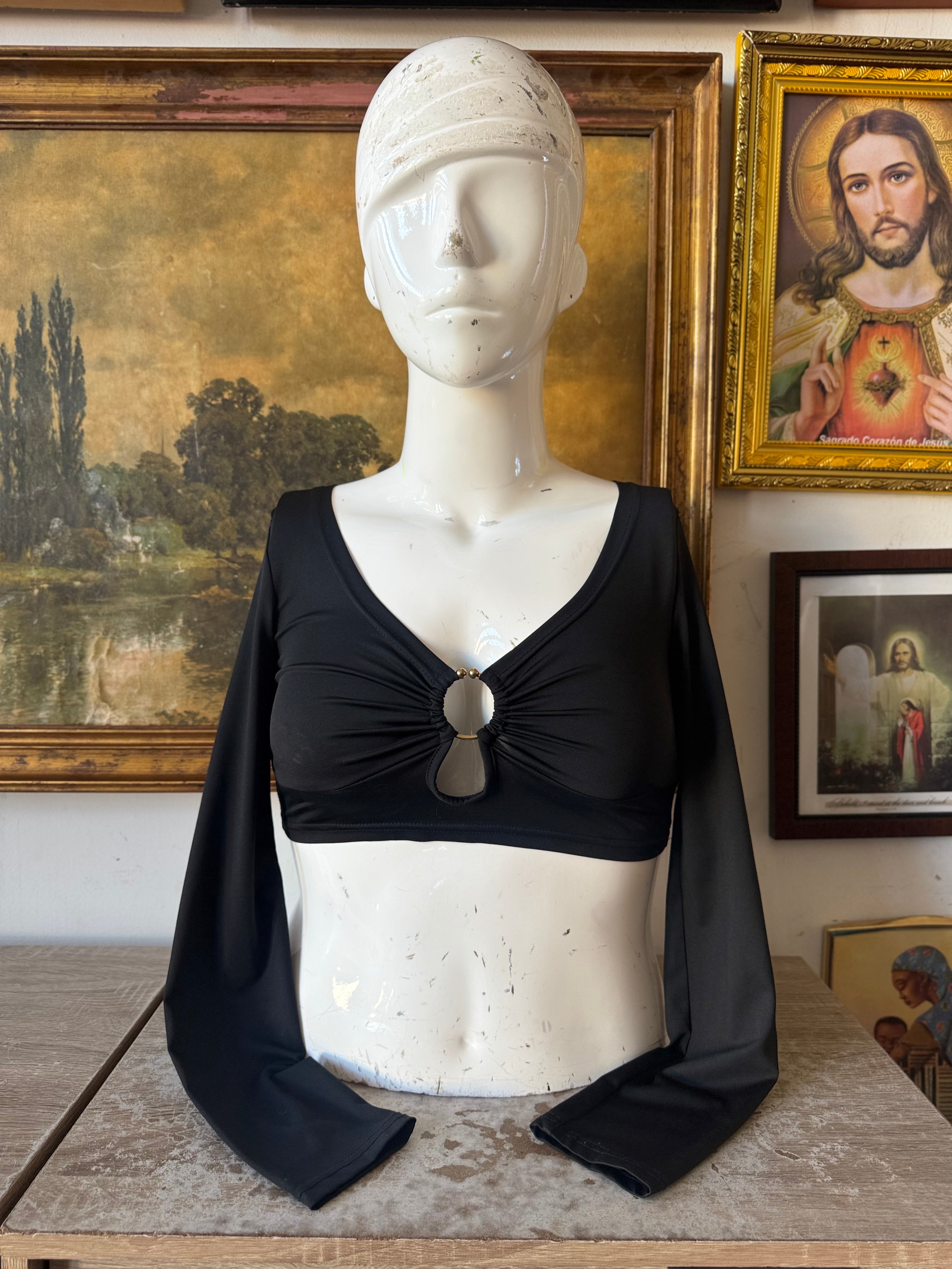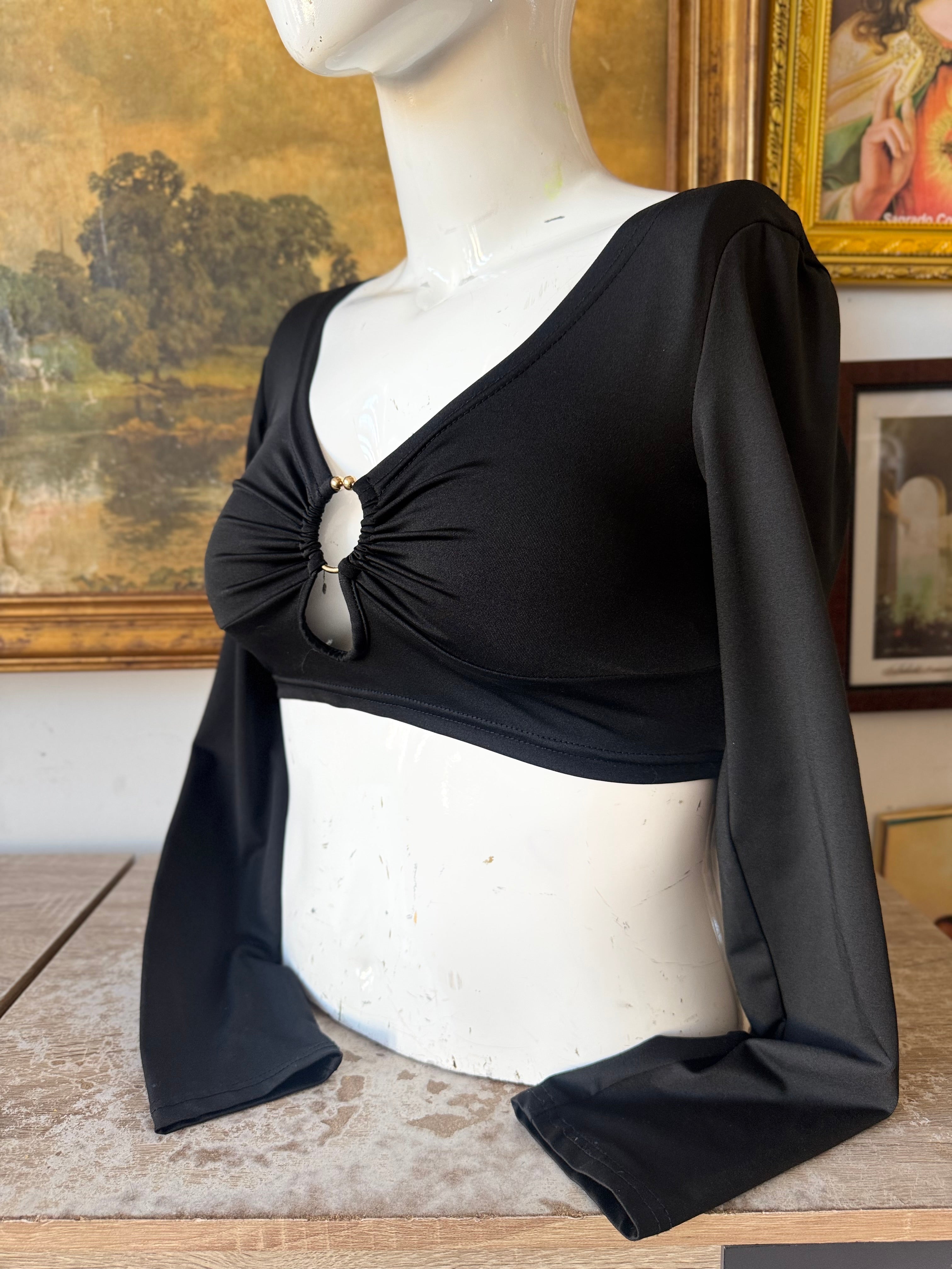 Description: Black Long-sleeve O Ring Going Out Crop Top.