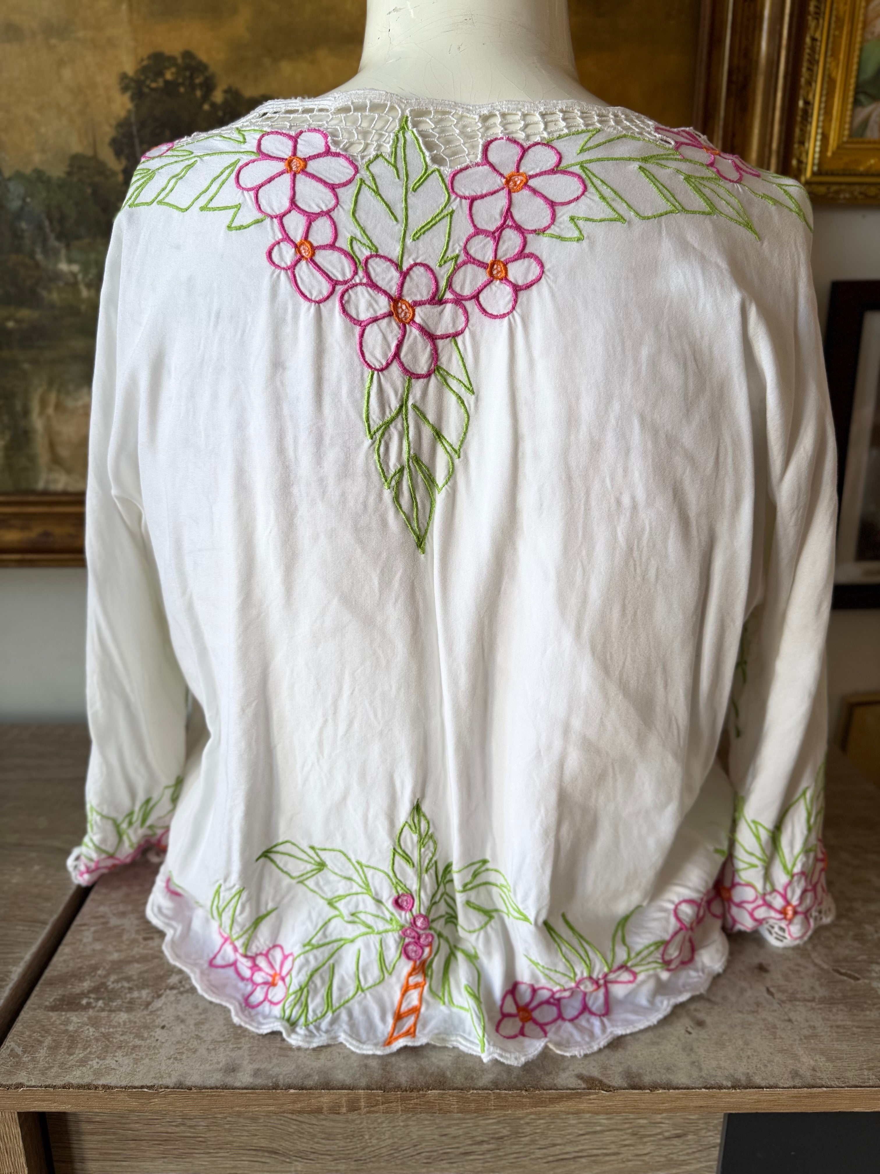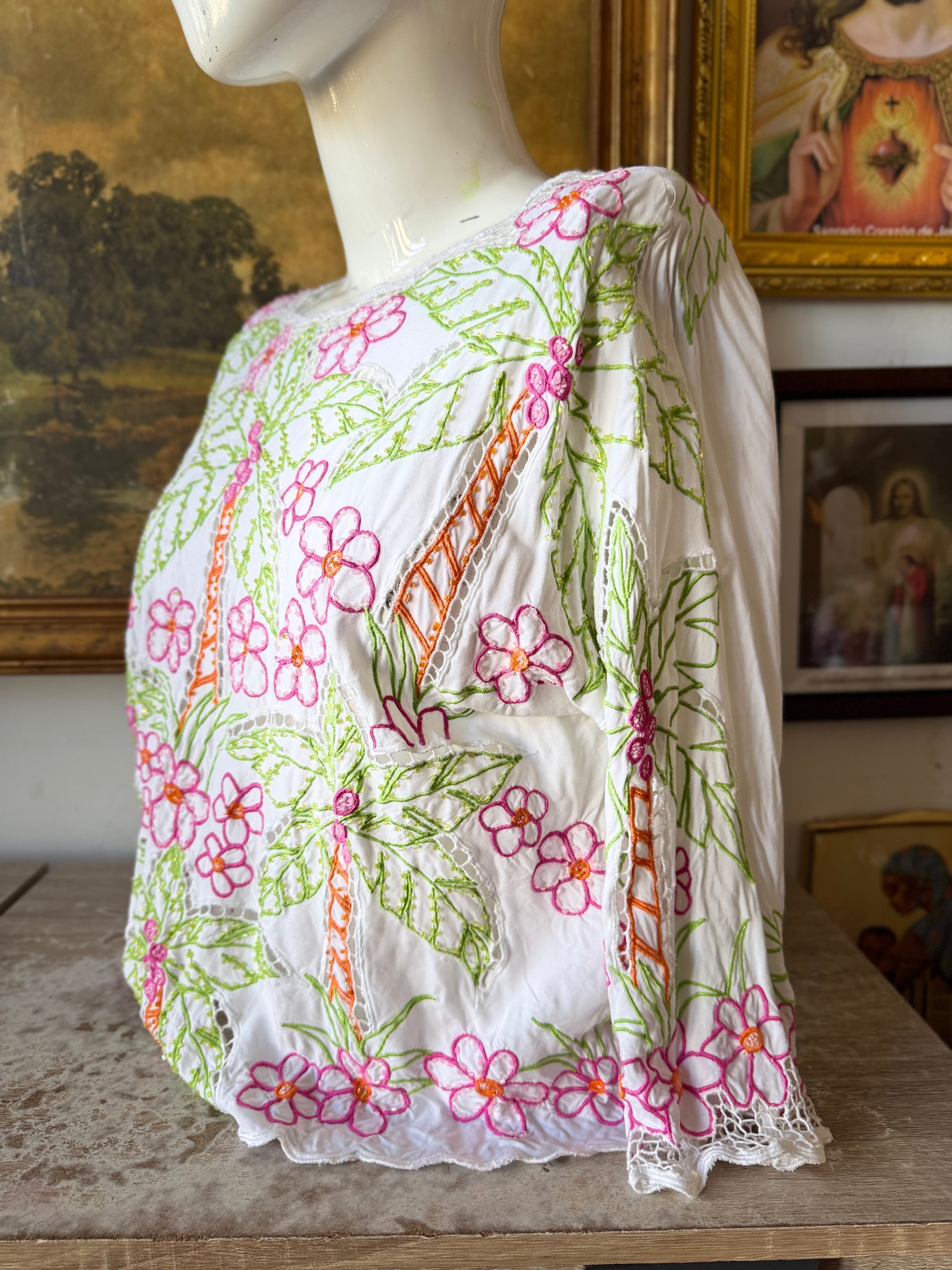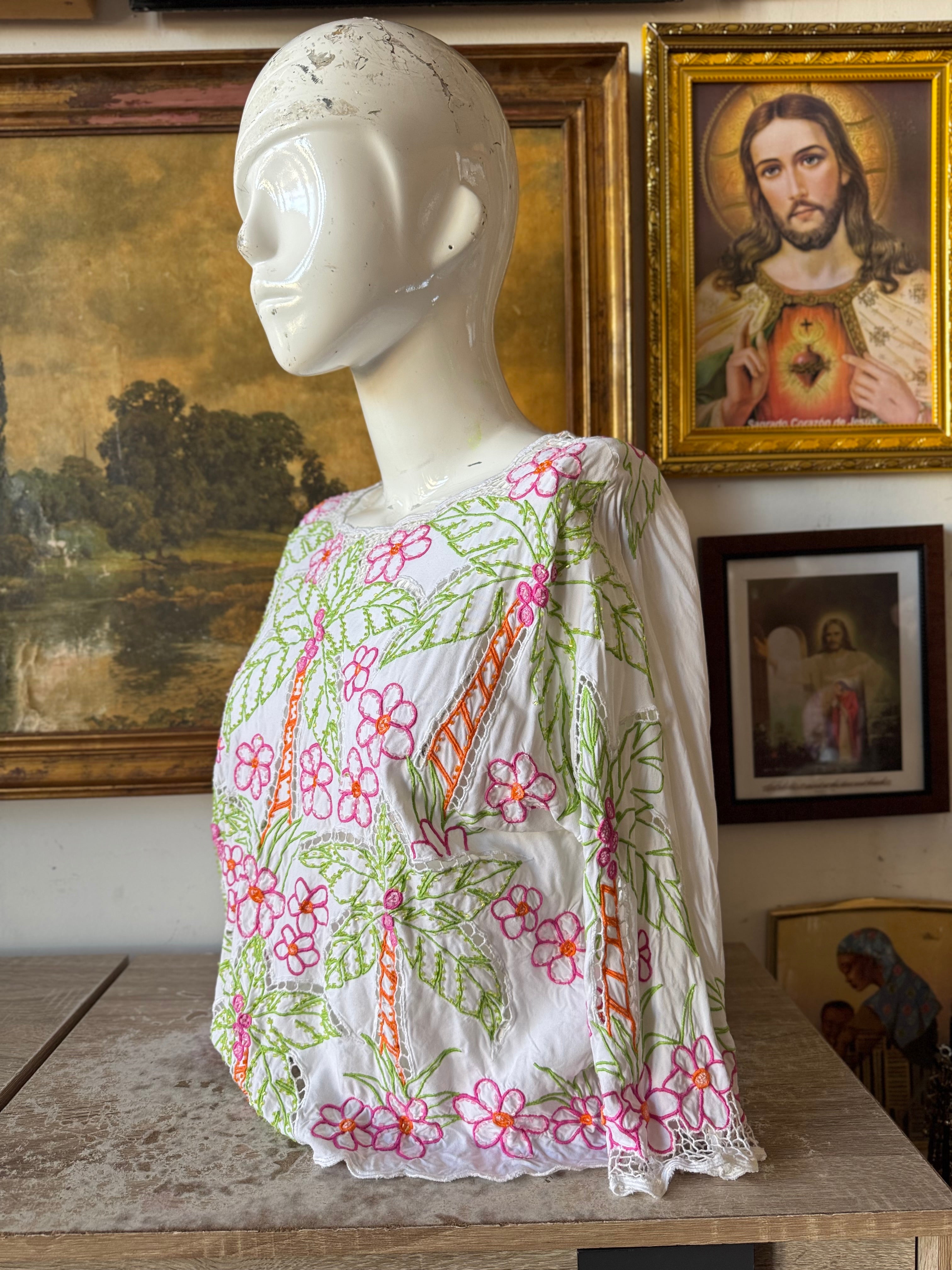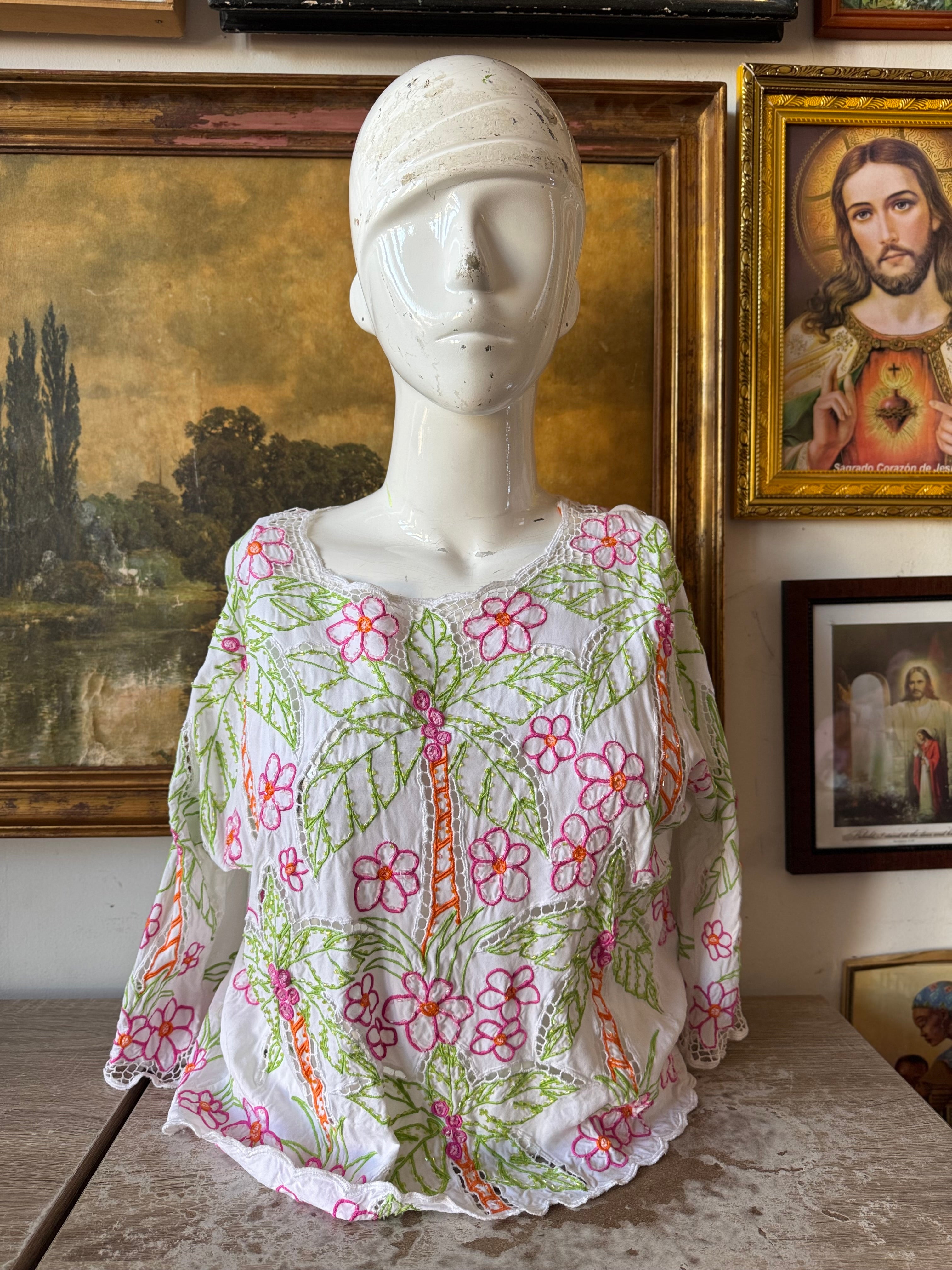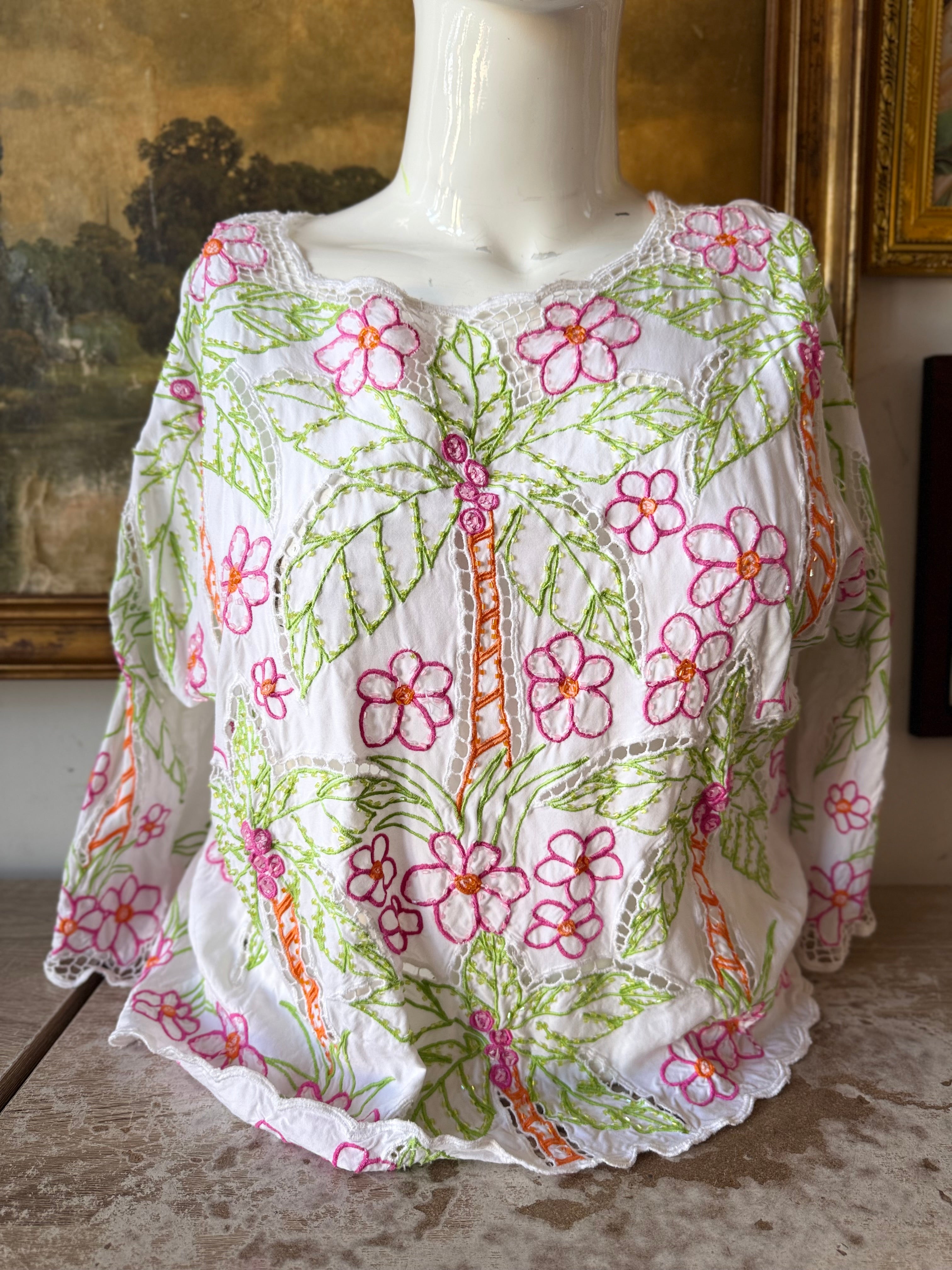 Vintage Sequin Pink and Lime Tropical Short Sleeve Top Ladies Size XL