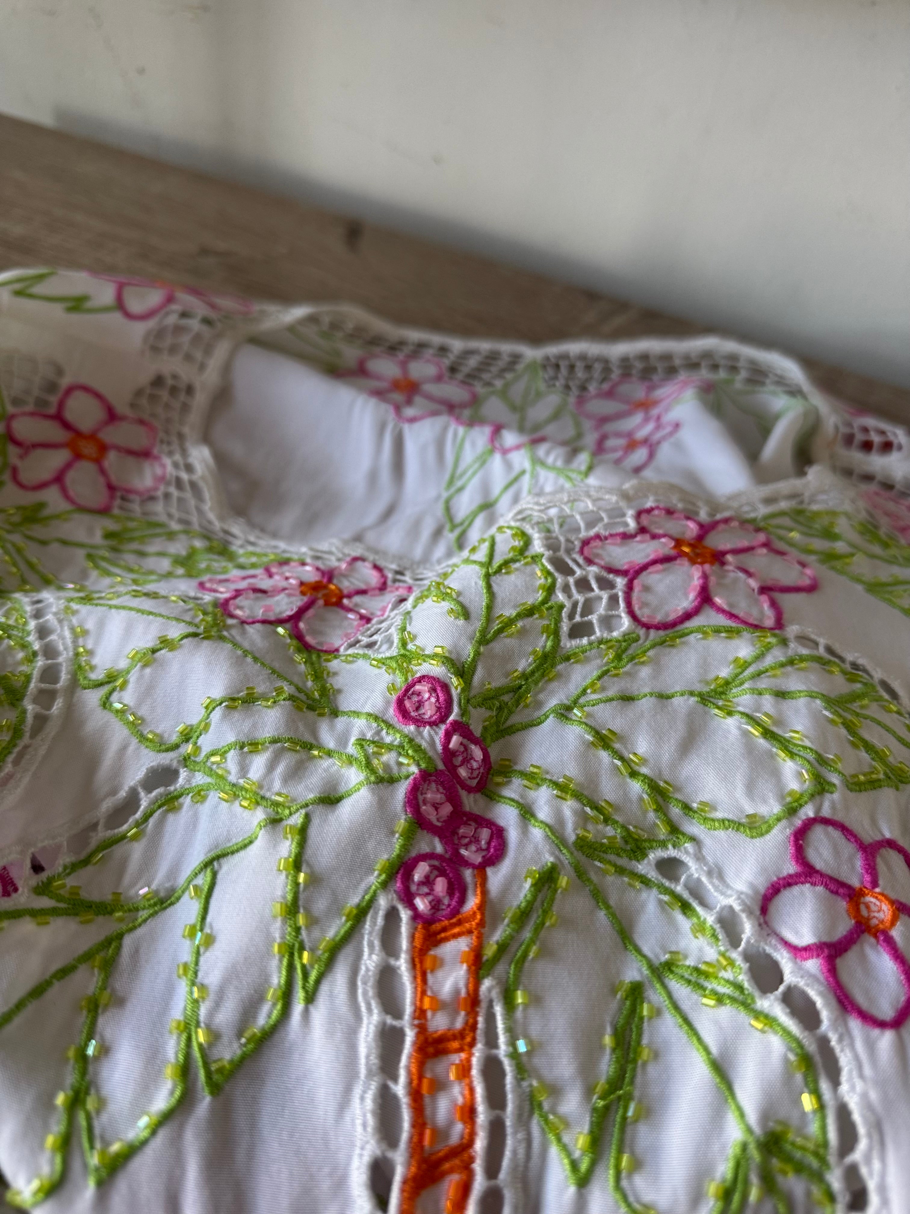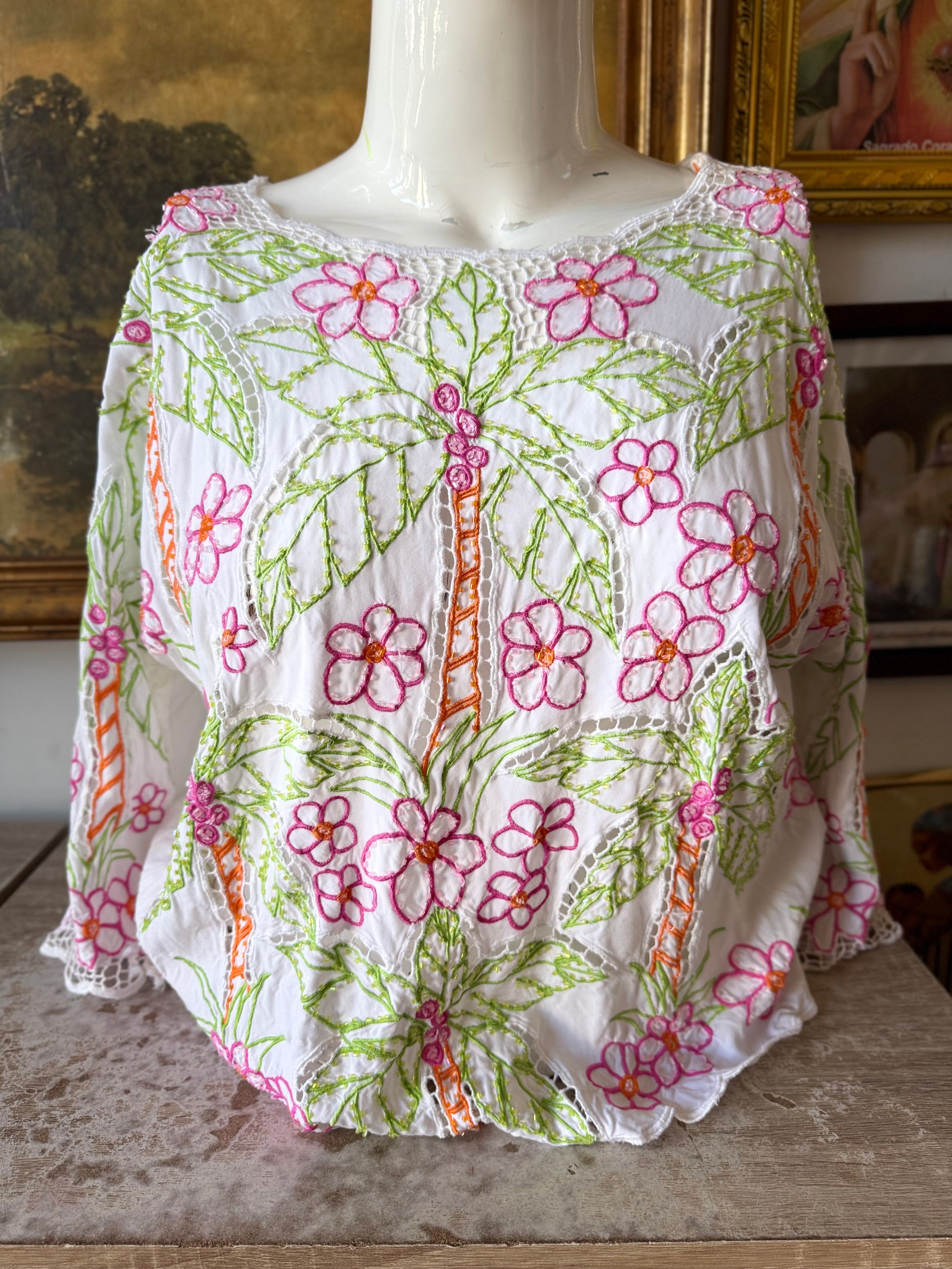 Vintage Sequin Pink and Lime Tropical Short Sleeve Top Ladies Size Large