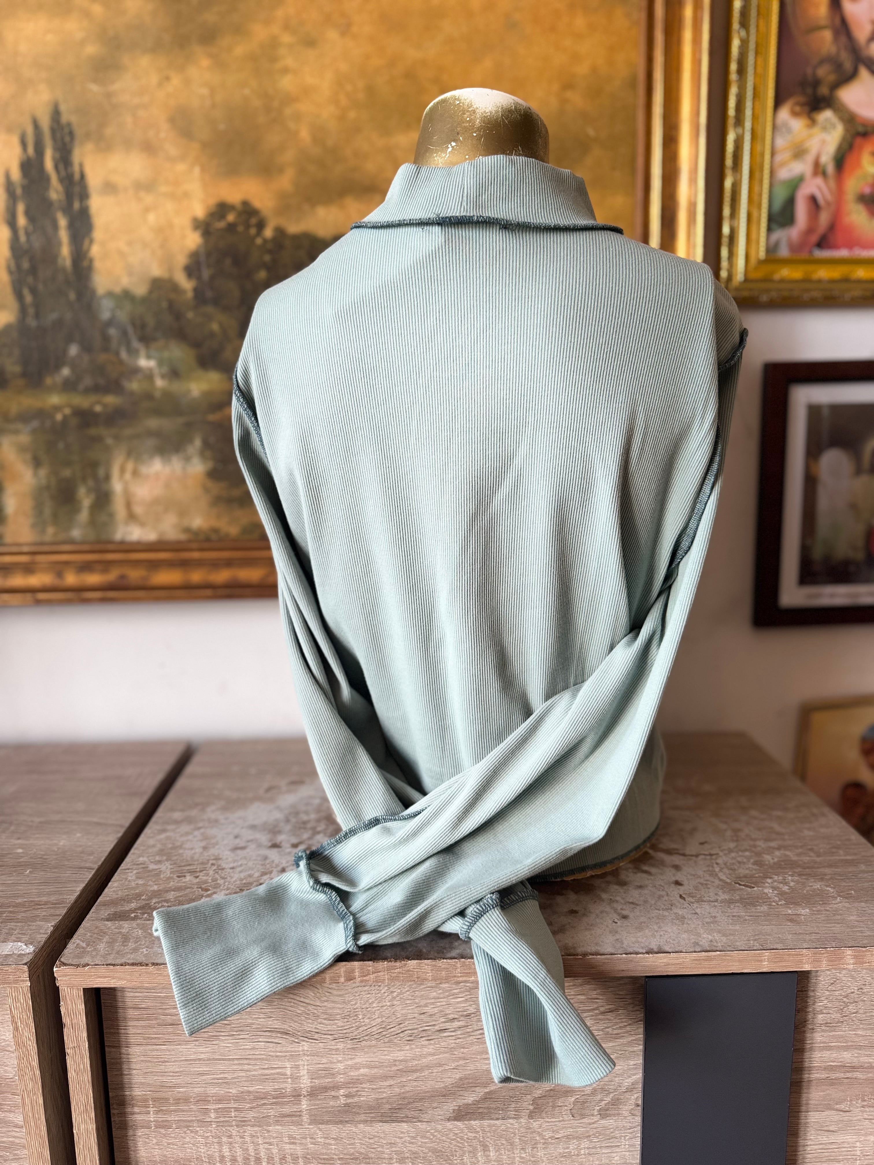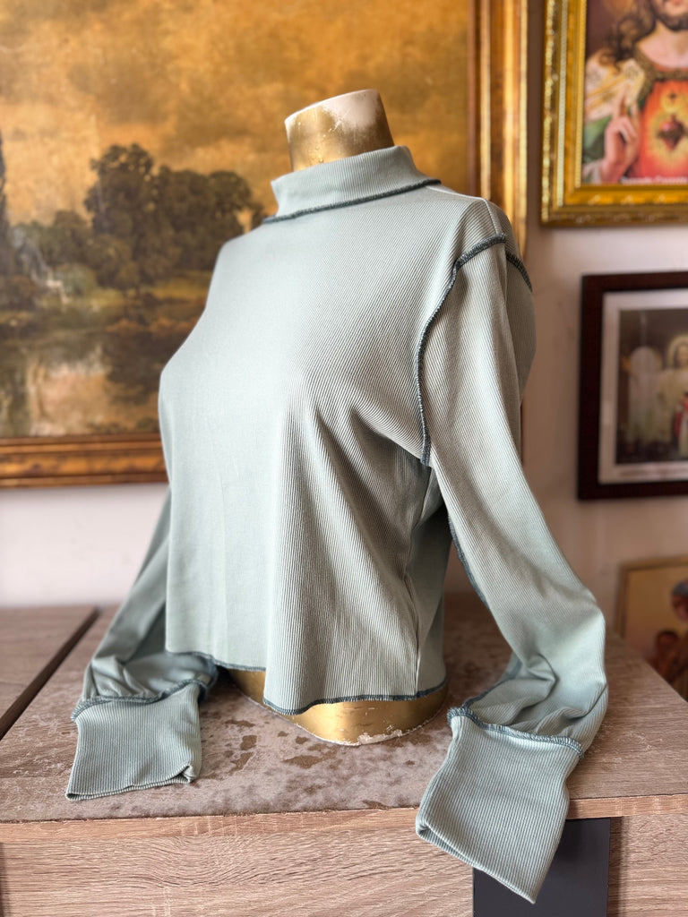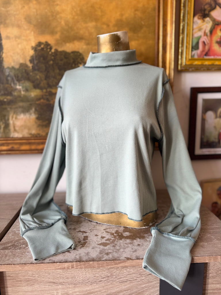 Sage Green Ribbed Contrast Stitch Mock Neck Long Sleeve Top Size S