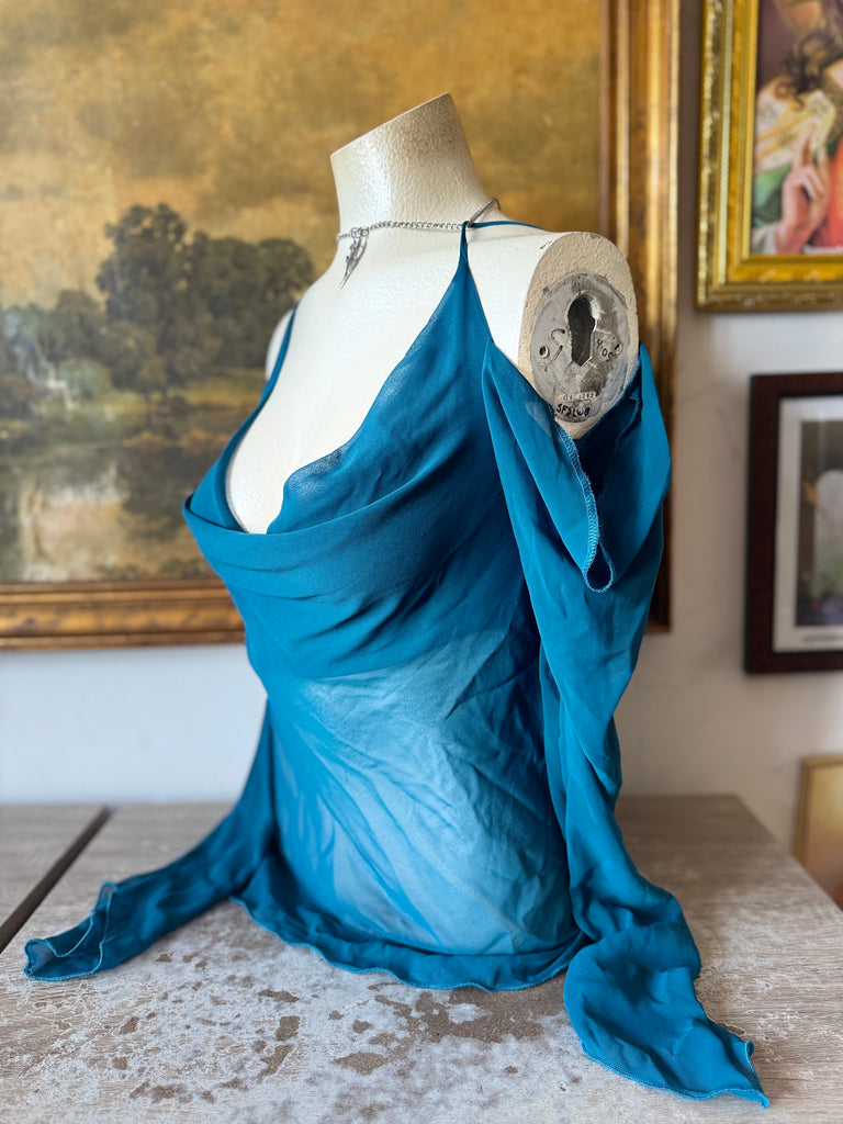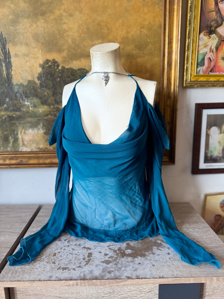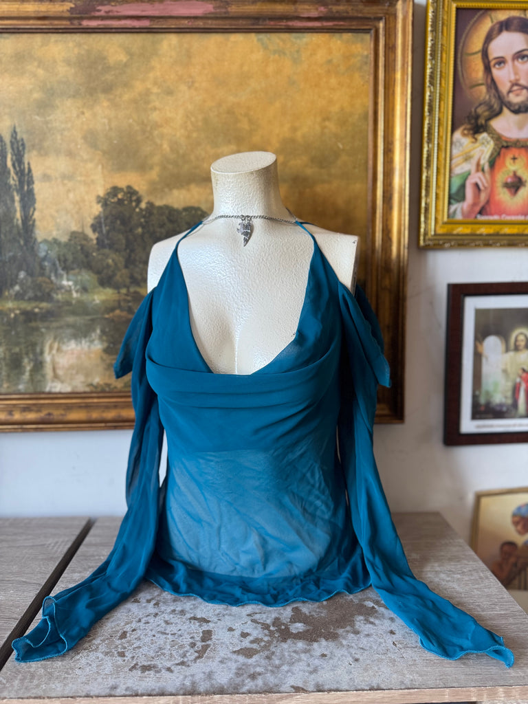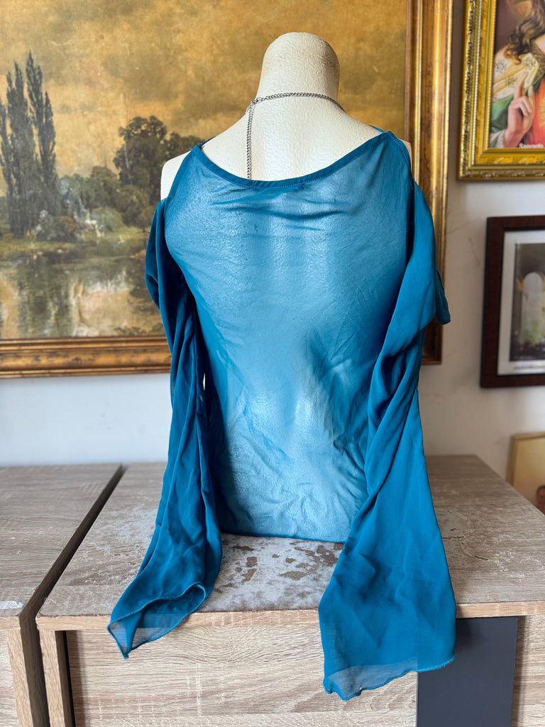 Y2k Teal Sheer Cold Shoulder Slouch Front Top Size S/M AS IS