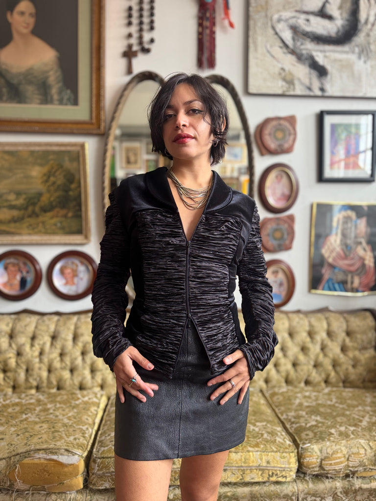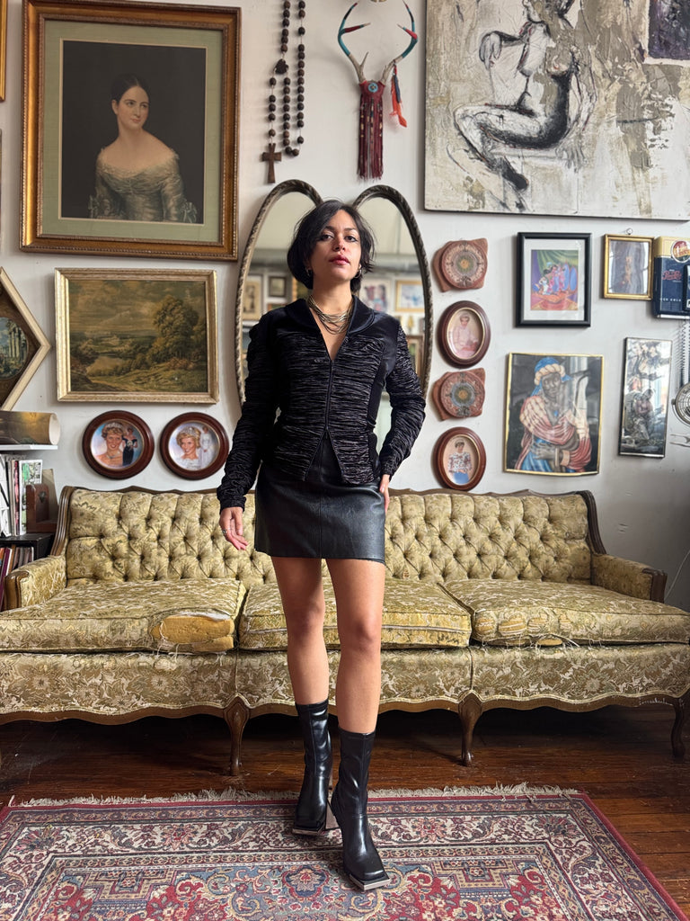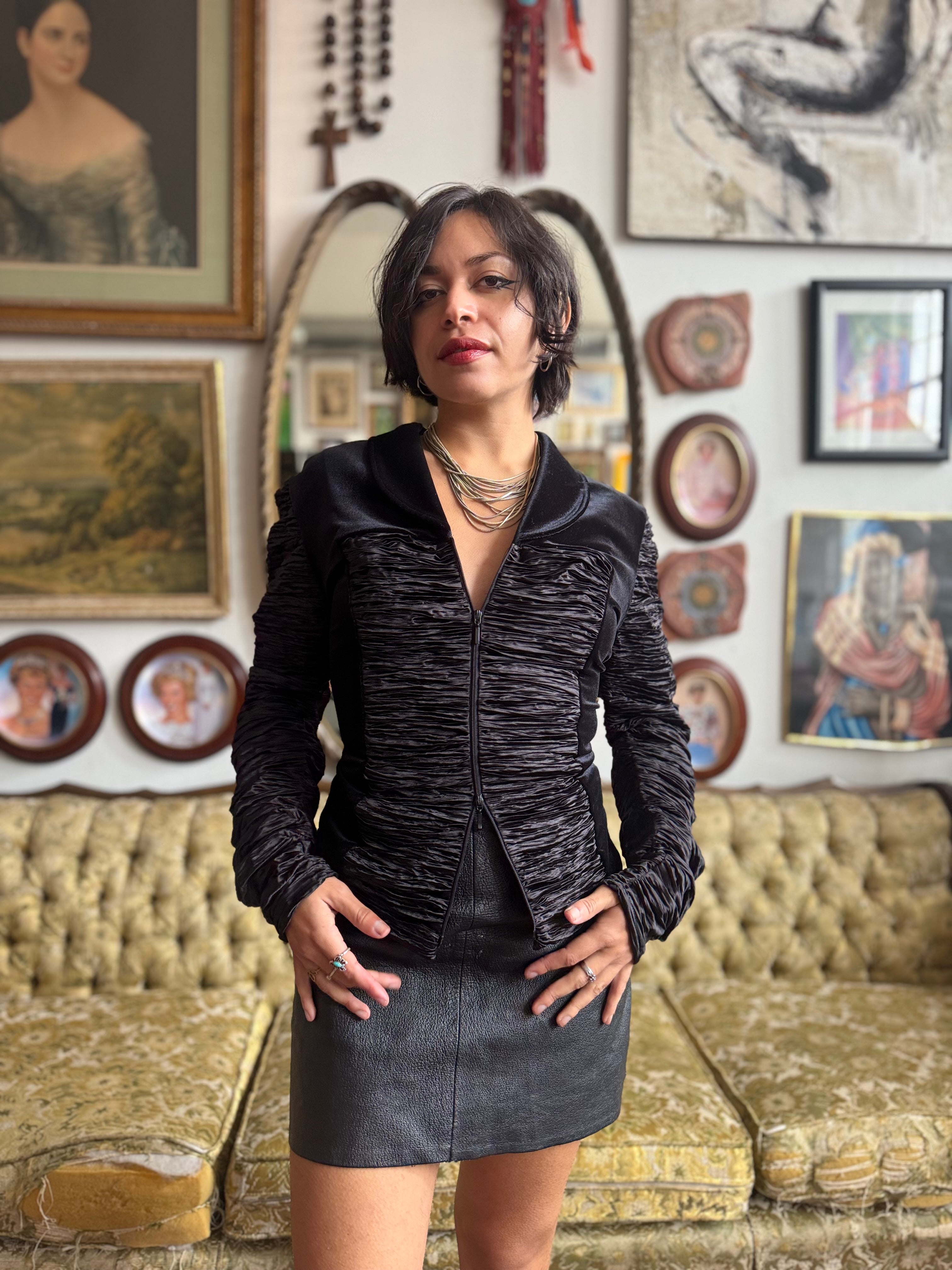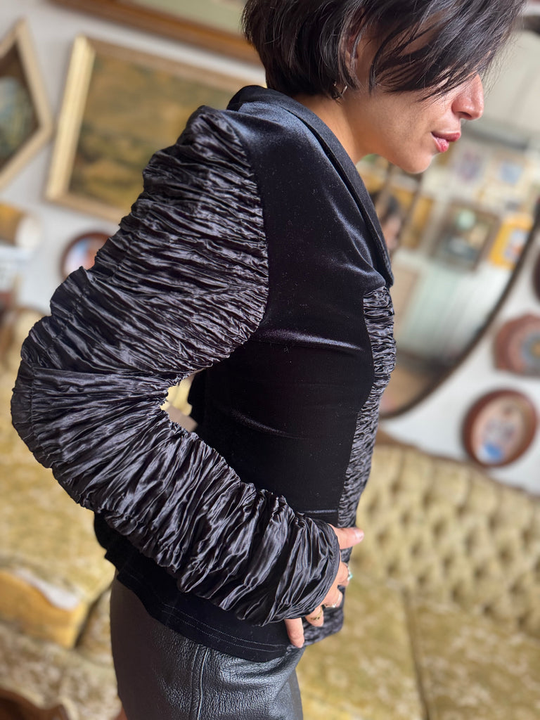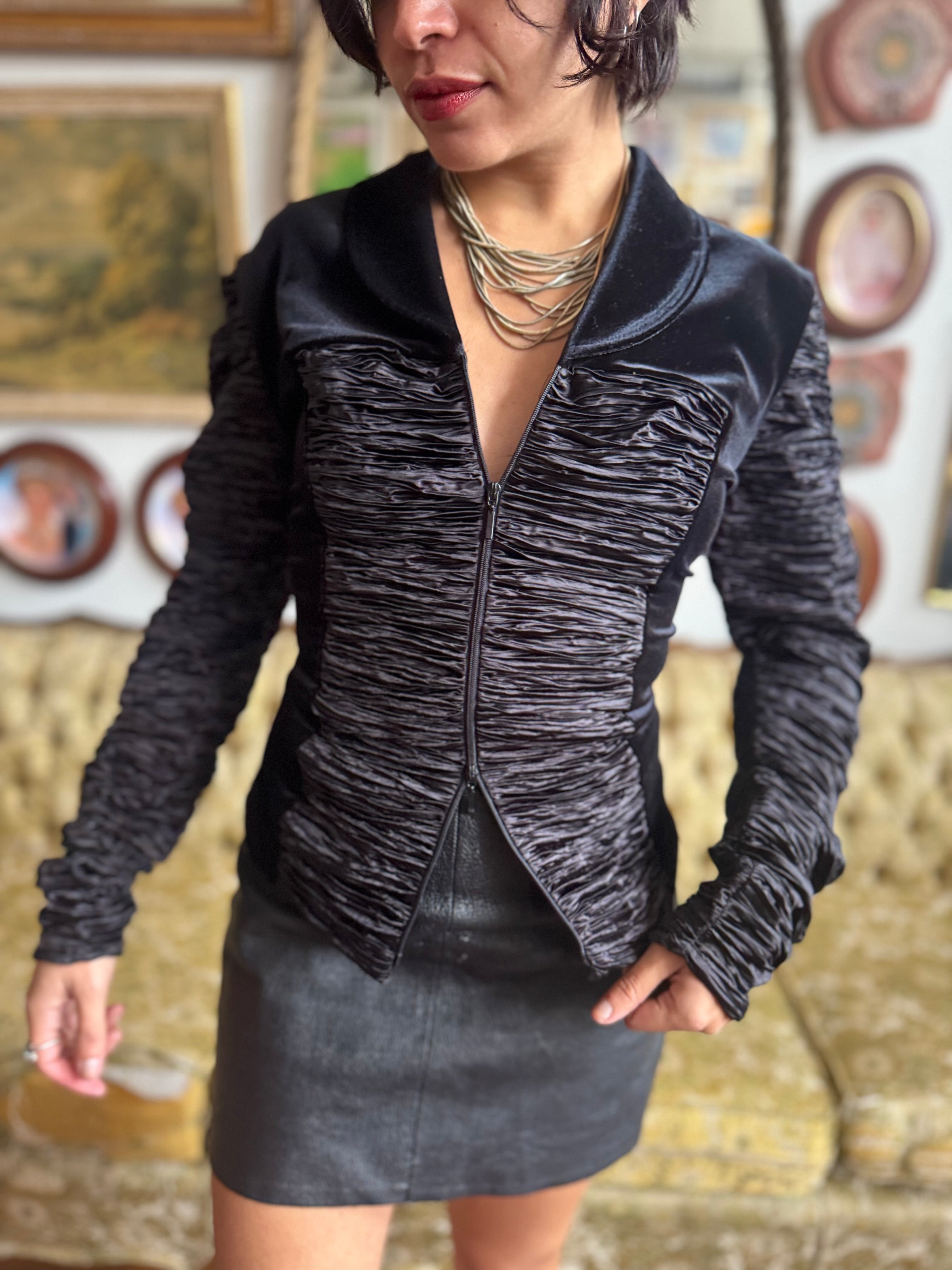 Y2K Black Velvet Accordion Zip Blouse w Exaggerated Sleeves Size Medium by Samuel Dong