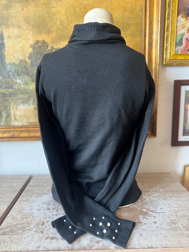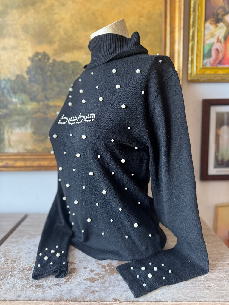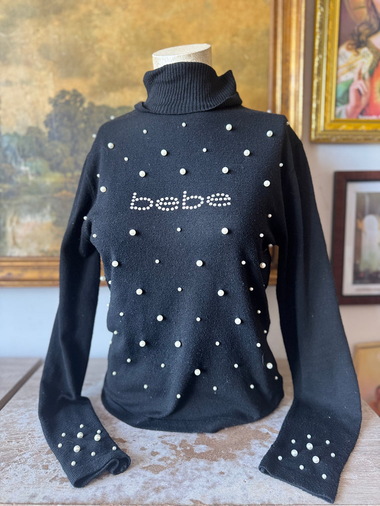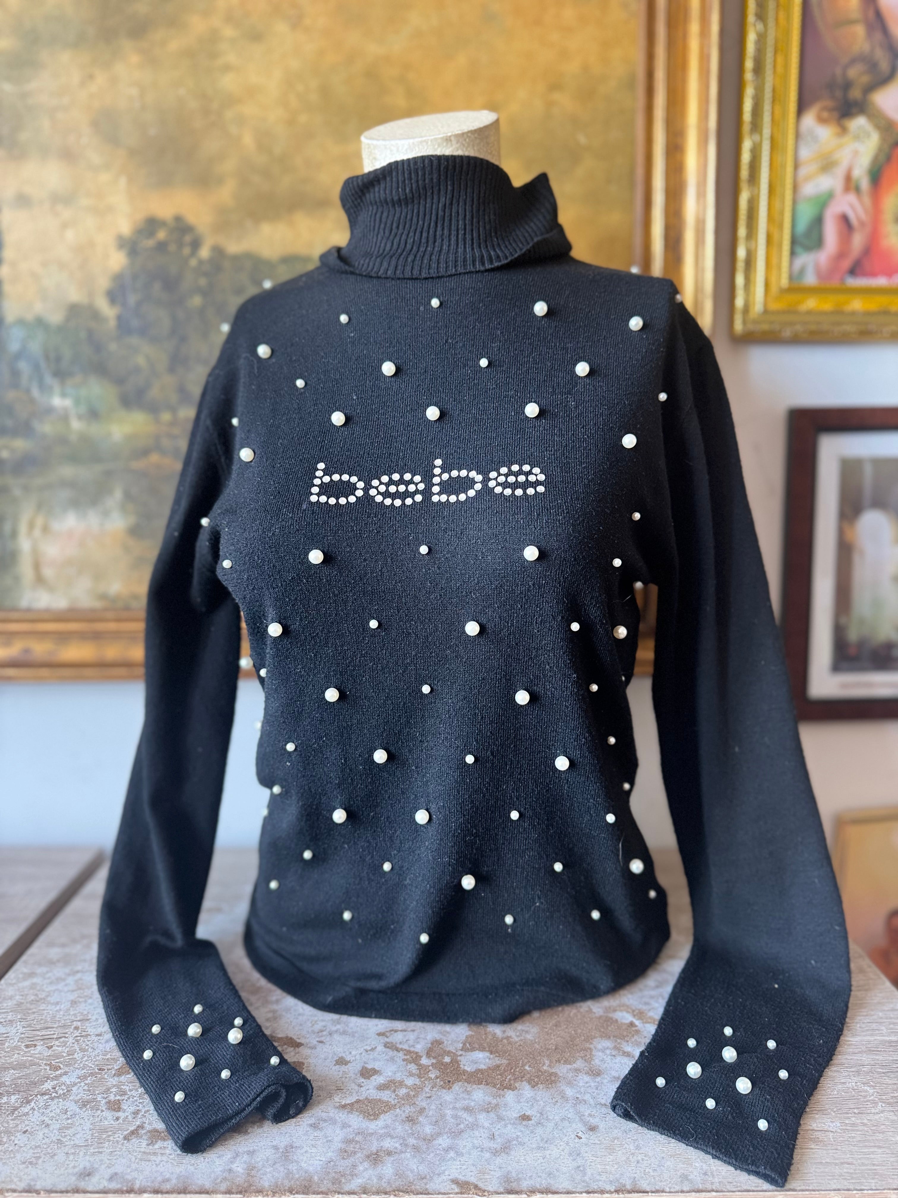 Bebe Black Knit Pearl Rhinestone Logo Turtleneck Size L