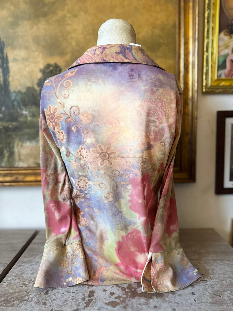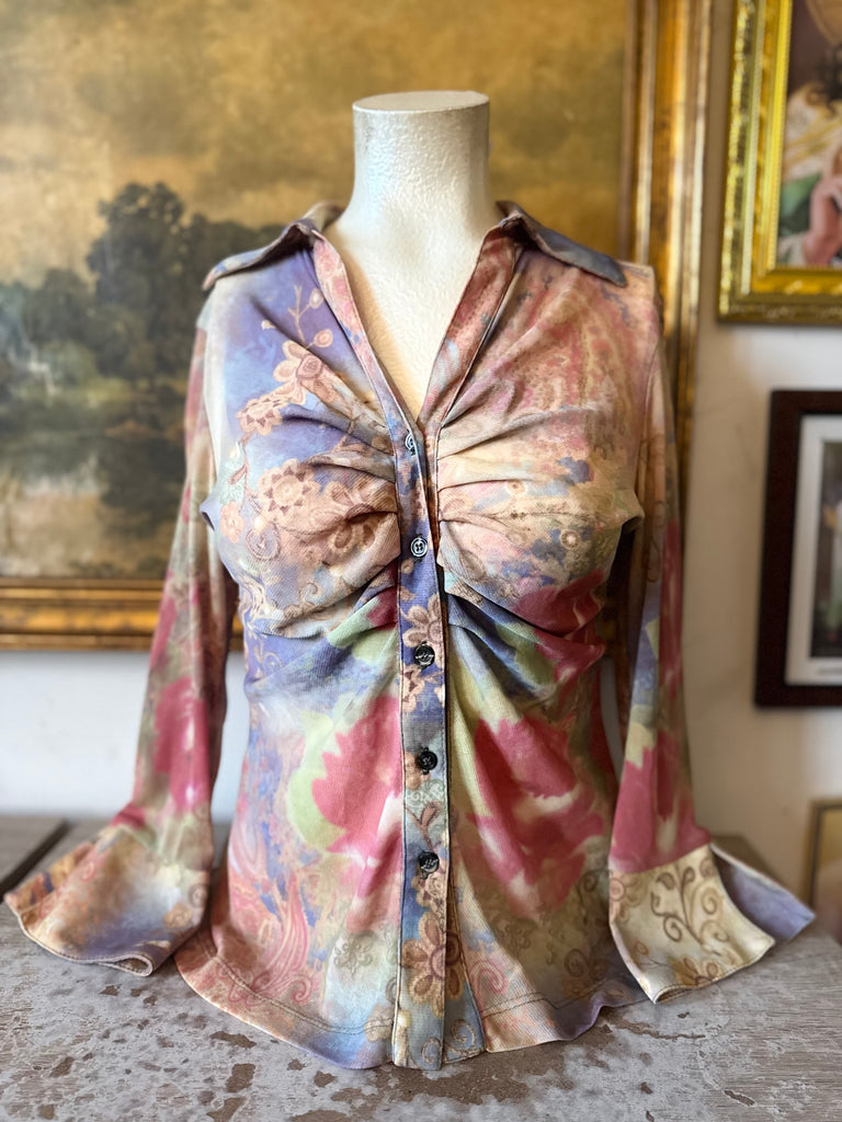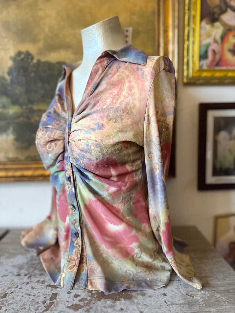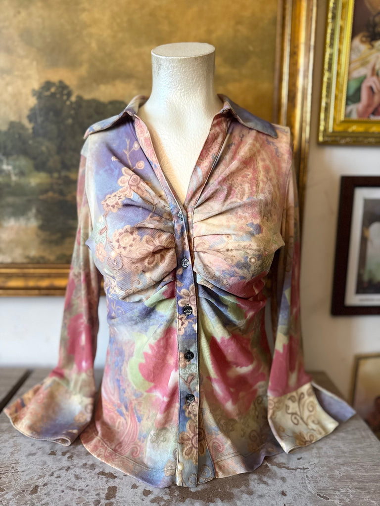 Vintage Y2k Boho Chic Floral Paisley Mesh Button Front Top Size M
